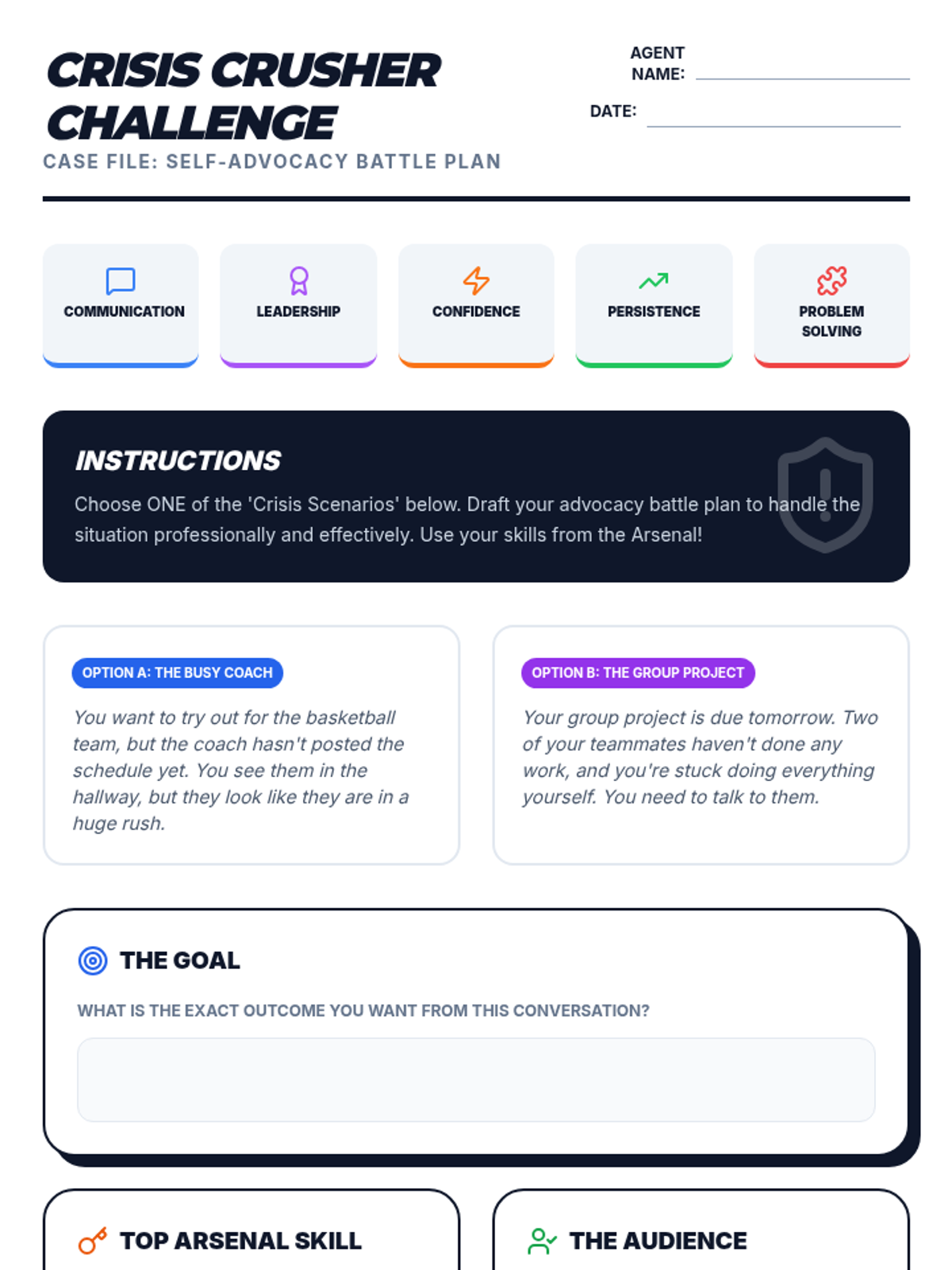 An engaging 'Crisis Crusher' activity sheet where students choose a real-life scenario and draft an advocacy 'battle plan'. Includes space for defining goals, selecting skills, and scripting an opening statement.