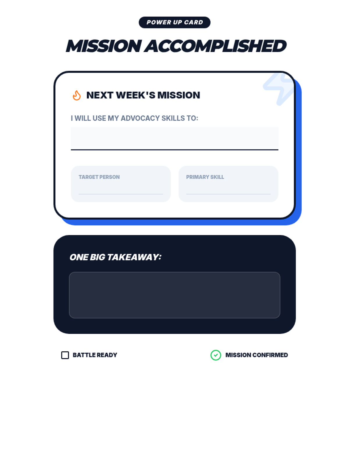 A punchy, post-lesson 'Power Up' card for students to commit to a specific advocacy mission and reflect on their learning.