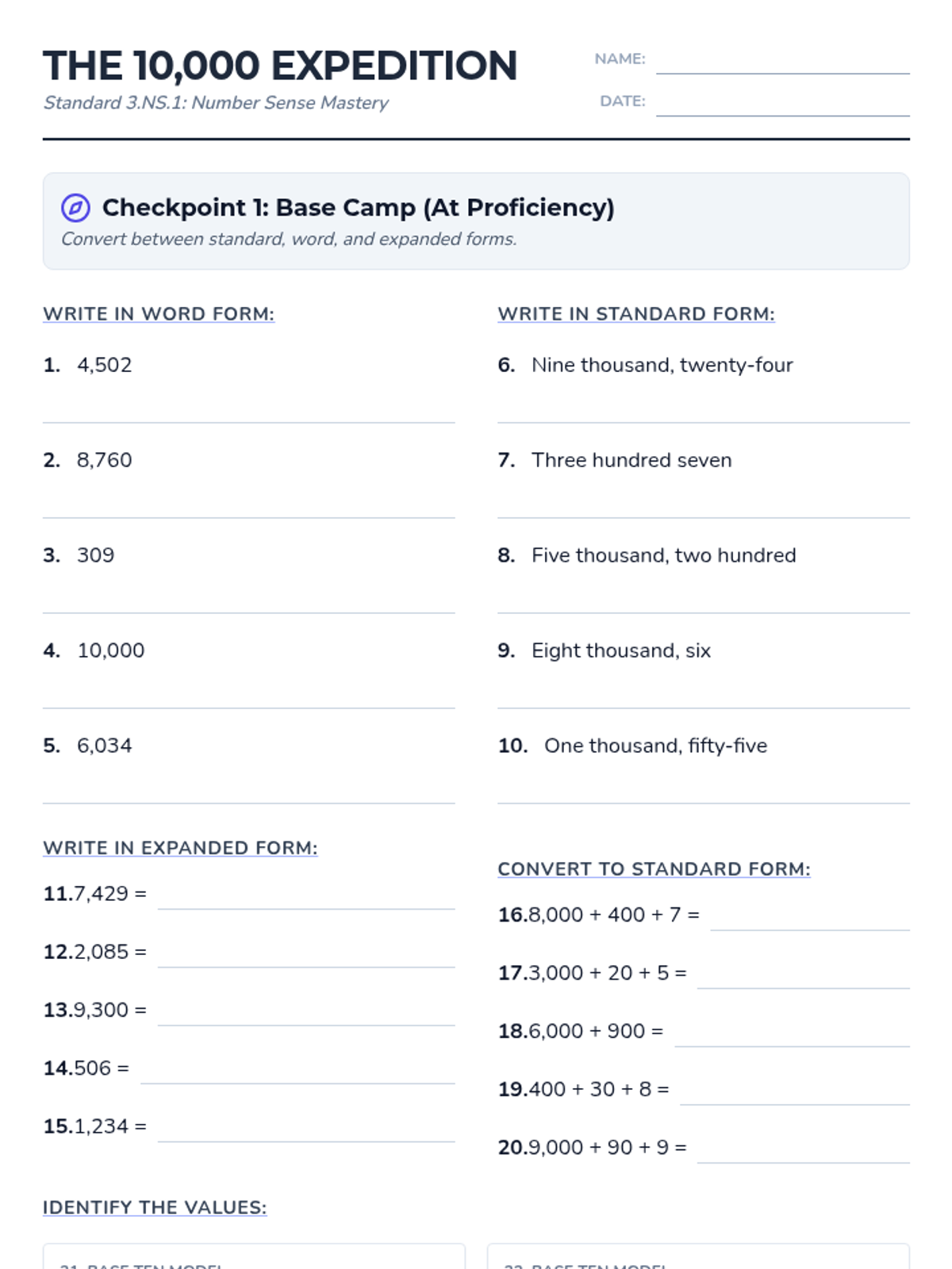 A 5-slide visual presentation to introduce Indiana standard 3.NS.1. It covers standard, word, and expanded forms, as well as complex regrouping (Above Proficiency) concepts to prepare students for the 50-problem worksheet. Optimized for large-scale visibility.