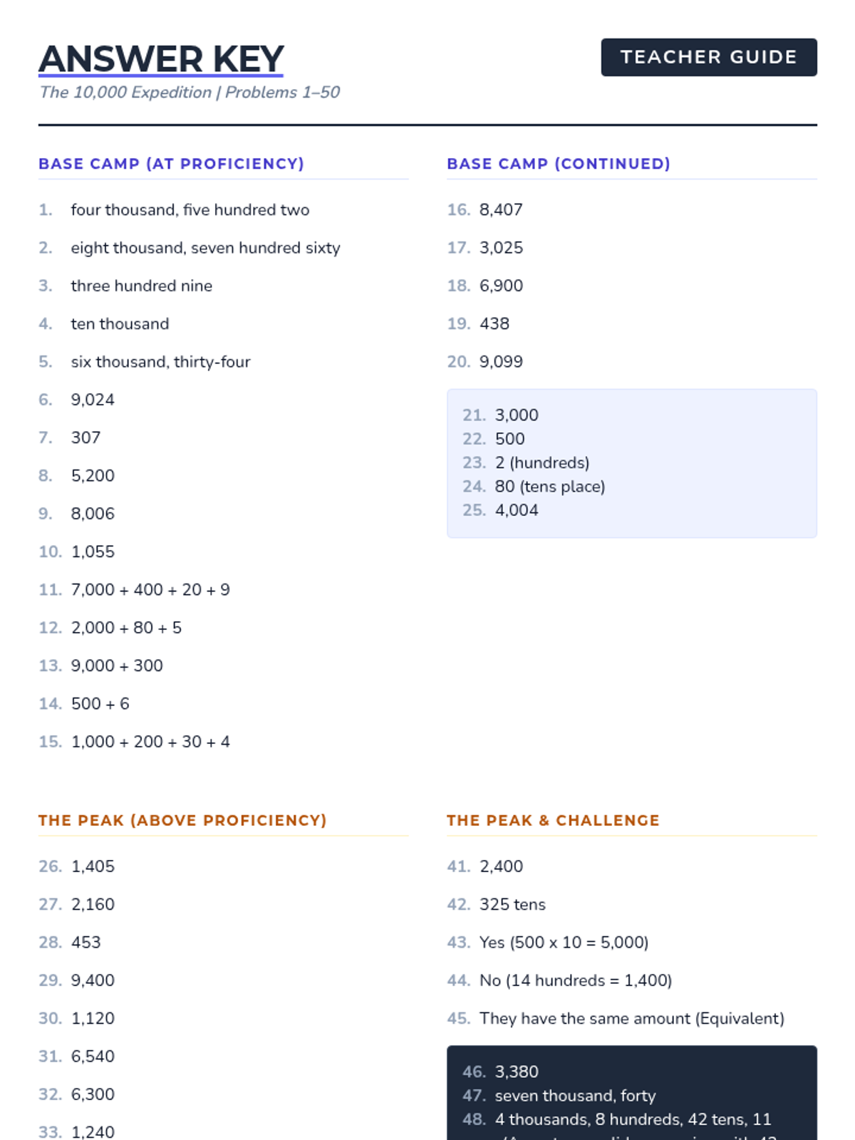 One-page answer key for the Expedition Place Value Worksheet, optimized for quick grading with high-contrast text and a clear grid layout.