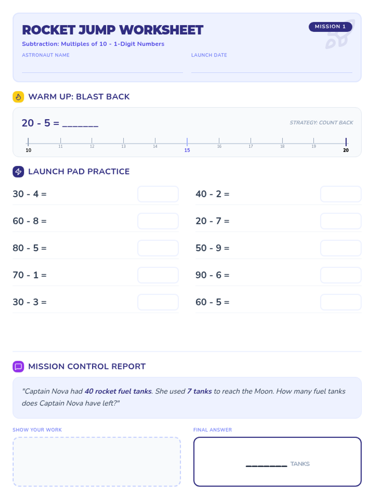 A space-themed practice worksheet for subtracting 1-digit numbers from multiples of ten, designed to fit perfectly on a single 8.5x11 printer page.