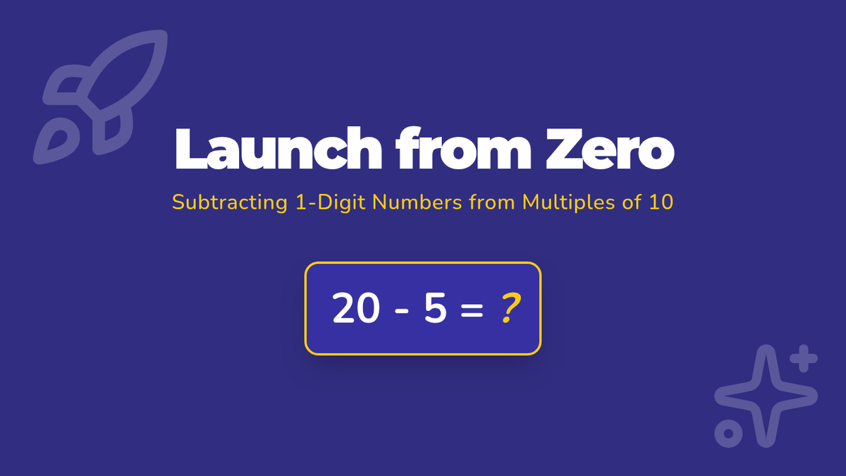 A visual presentation explaining strategies for subtracting 1-digit numbers from multiples of ten, including counting back and regrouping techniques with a space-themed design.