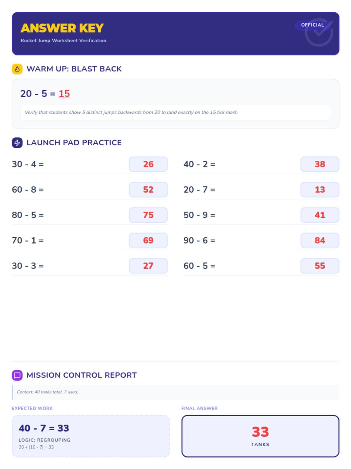 The corresponding answer key for the Rocket Jump Worksheet, designed to fit a single 8.5x11 printer page.