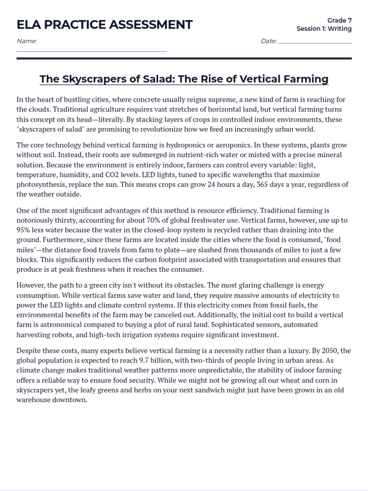 A comprehensive student practice packet featuring an informational passage about vertical farming followed by two short-response questions and one extended-response essay prompt, all designed to mirror the NYS 7th Grade ELA exam format.