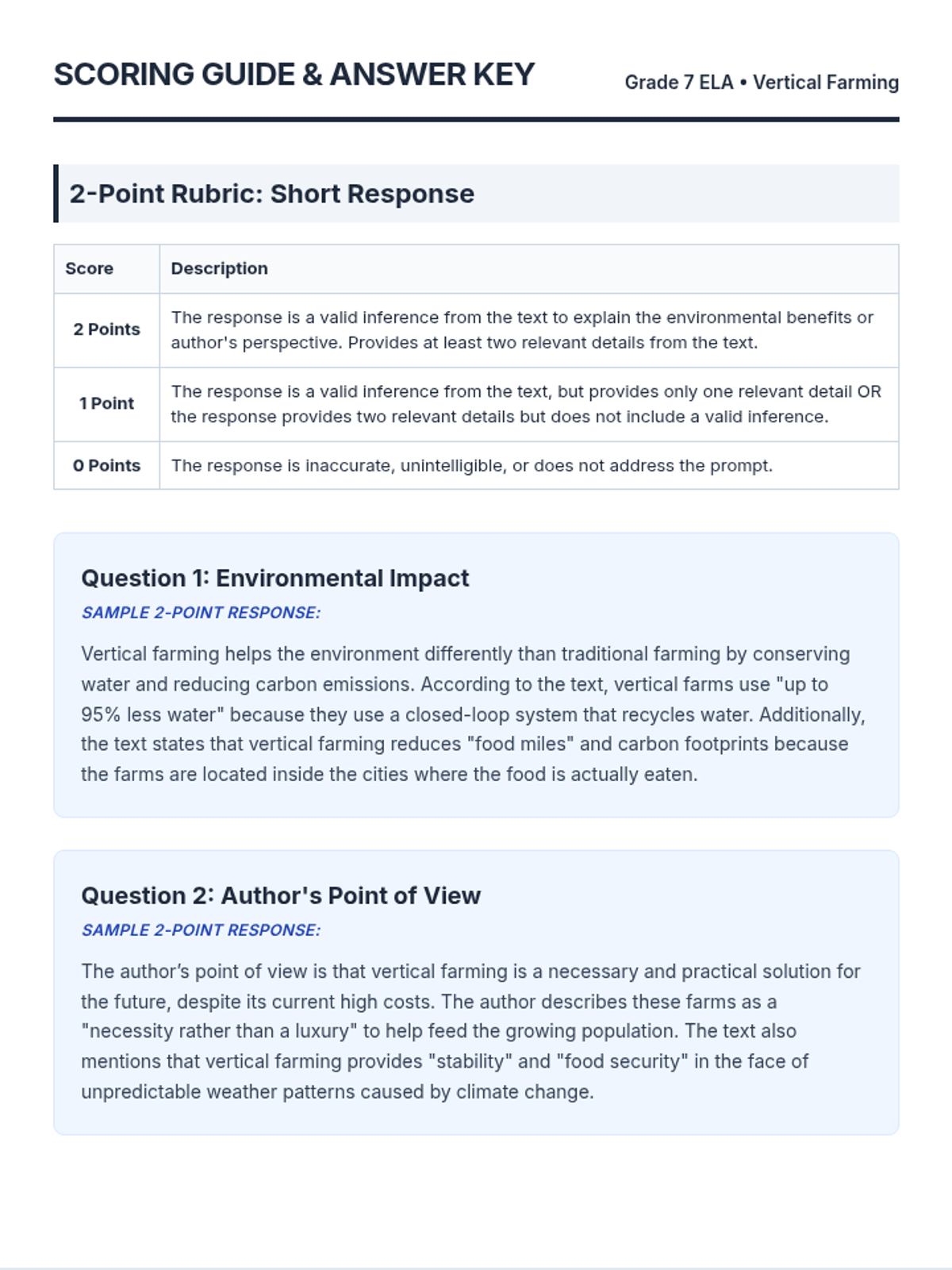 A detailed teacher scoring guide for the Vertical Farming writing practice, containing official NYS 2-point and 4-point rubrics, sample high-scoring student responses, and a breakdown of key evidence from the text.