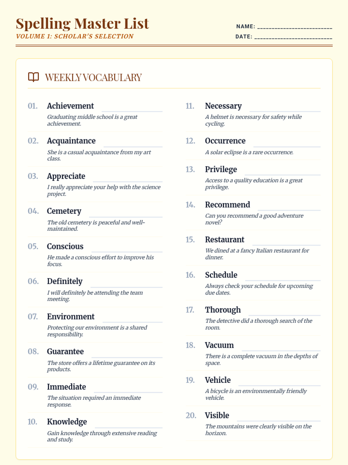 A vintage-themed spelling list for 6th-grade students featuring 20 academic words, sentences, and pneumonic tips. Tightened layout to ensure single-page printing and added practice lines.
