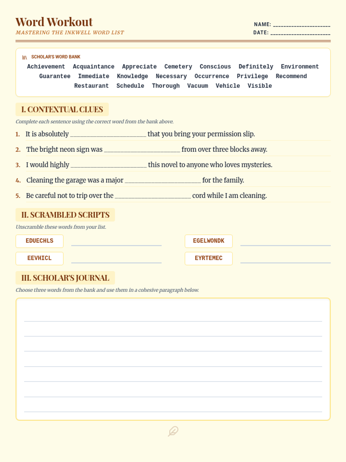 A practice worksheet for 6th grade spelling words featuring a word bank, context clues, word scrambles, and a writing prompt. Revised layout to fix sentence alignment and ensure page cohesion.