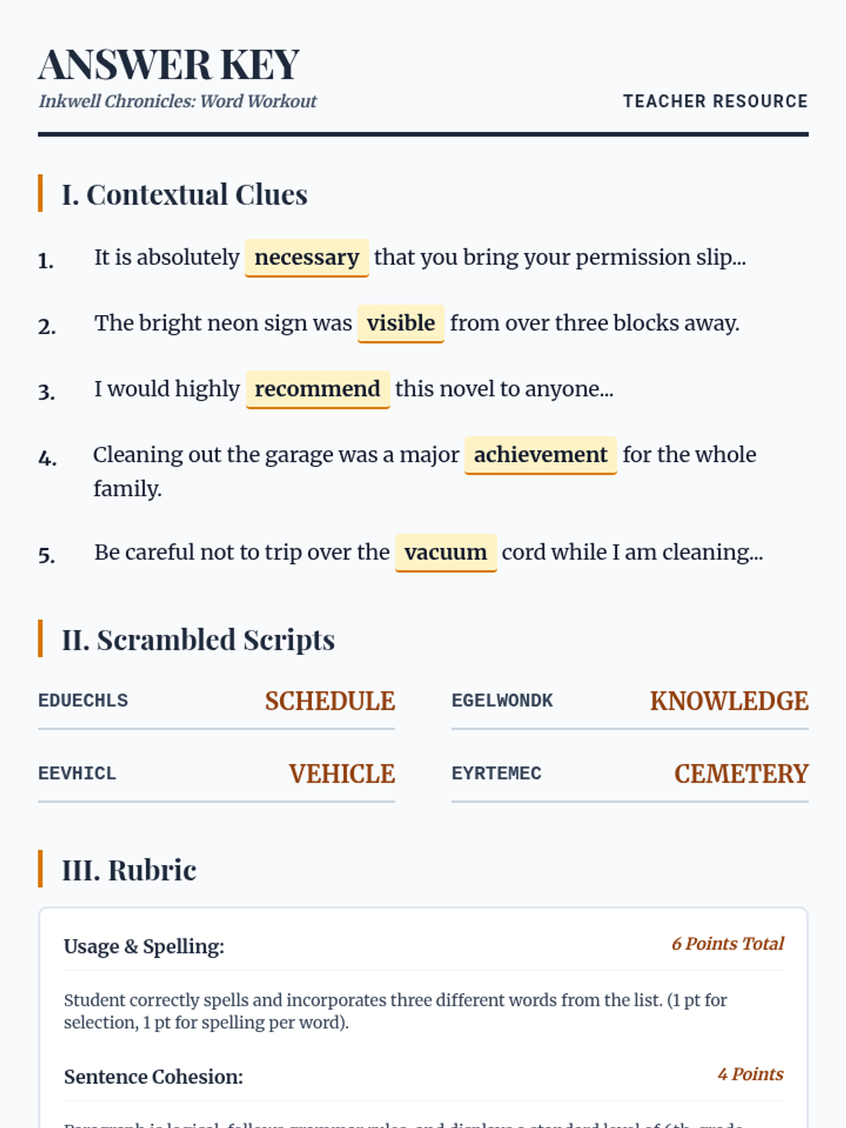 Teacher answer key and scoring rubric for the Word Workout spelling worksheet. Revised to fix page breaks, improve text contrast for printing, and fix line spacing.