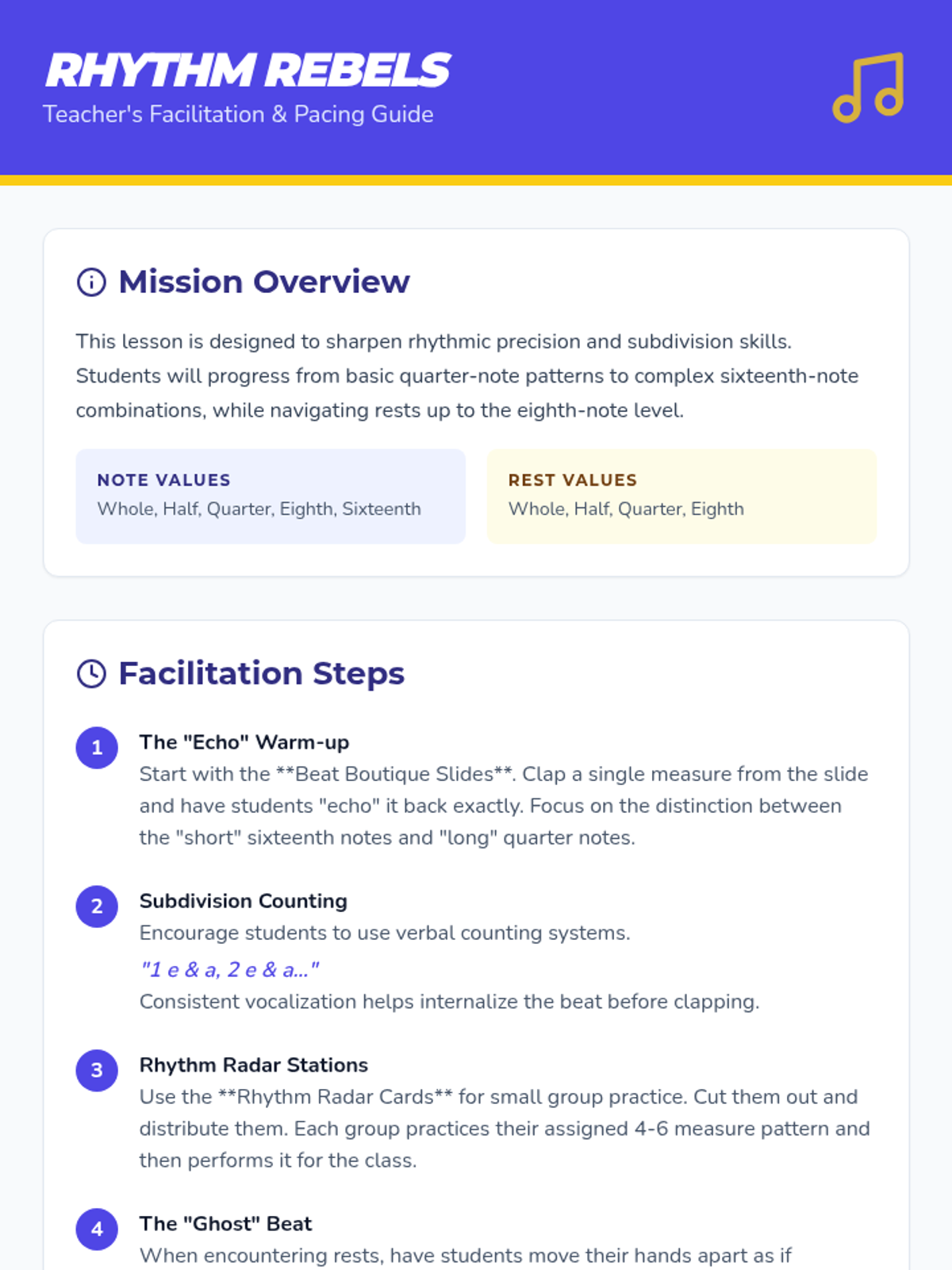 A detailed facilitator's guide for the Rhythm Rebels lesson, providing pacing tips, counting strategies, and differentiation ideas for music teachers.