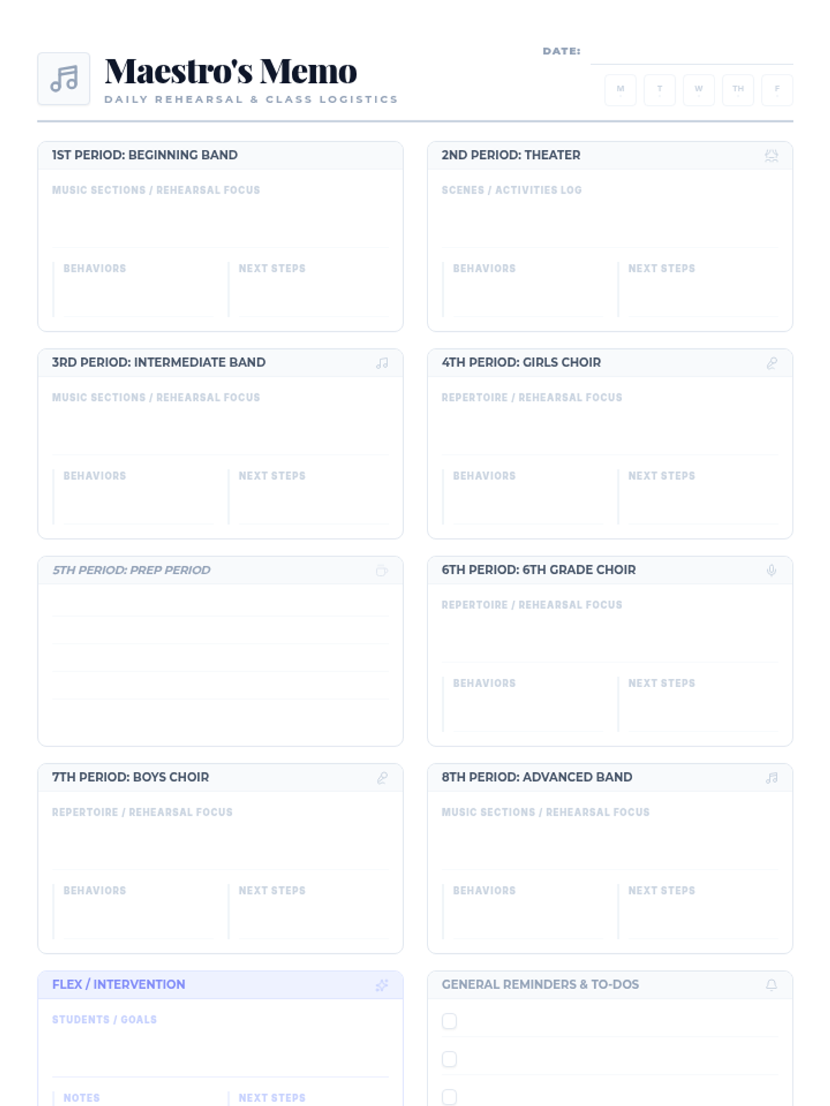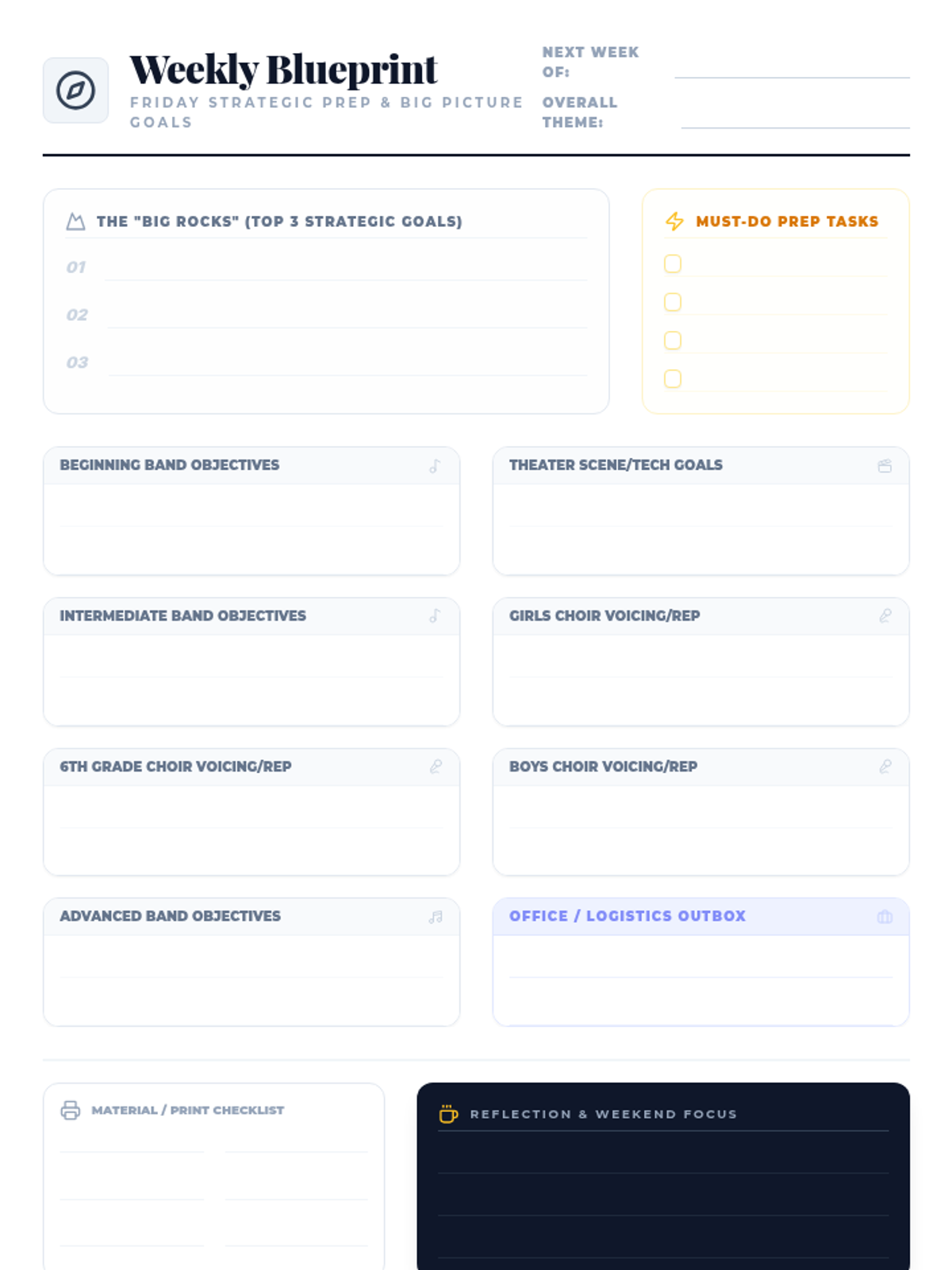 A light, strategic weekly planning sheet for music and theater teachers to organize "big picture" goals, repertoire objectives for each ensemble, and logistical prep tasks.