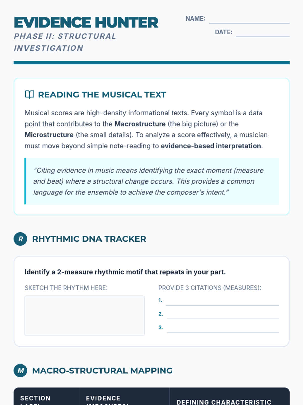 A rigorous analysis organizer for middle school music students that combines informational text reading with musical evidence collection, focusing on rhythmic motifs and formal structure.