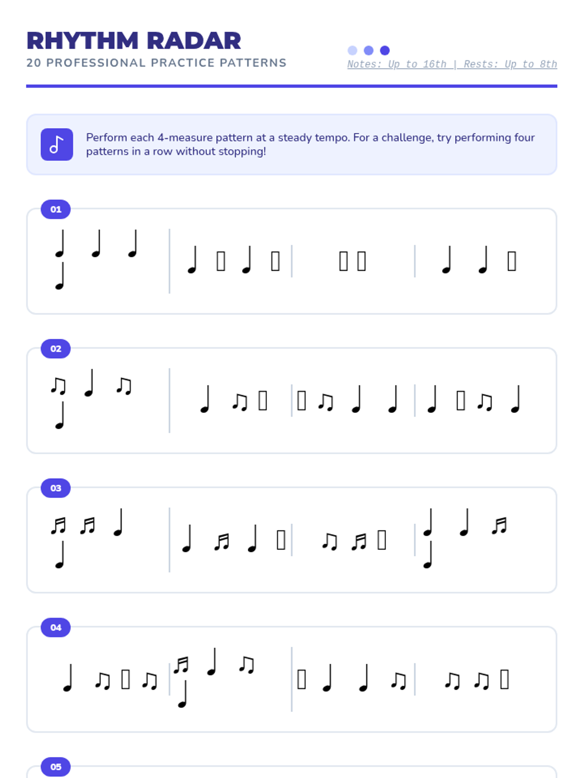 A comprehensive set of 20 rhythmic practice patterns for students, ranging from basic quarter notes to complex sixteenth-note combinations, presented in a clear, easy-to-read grid format.