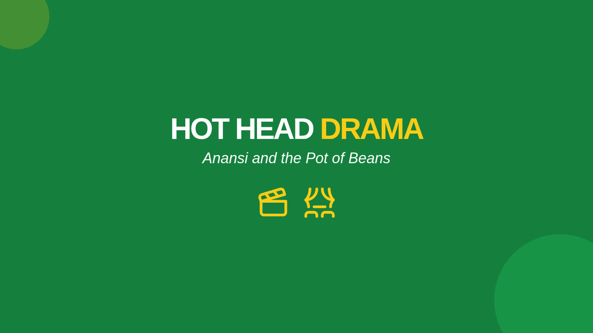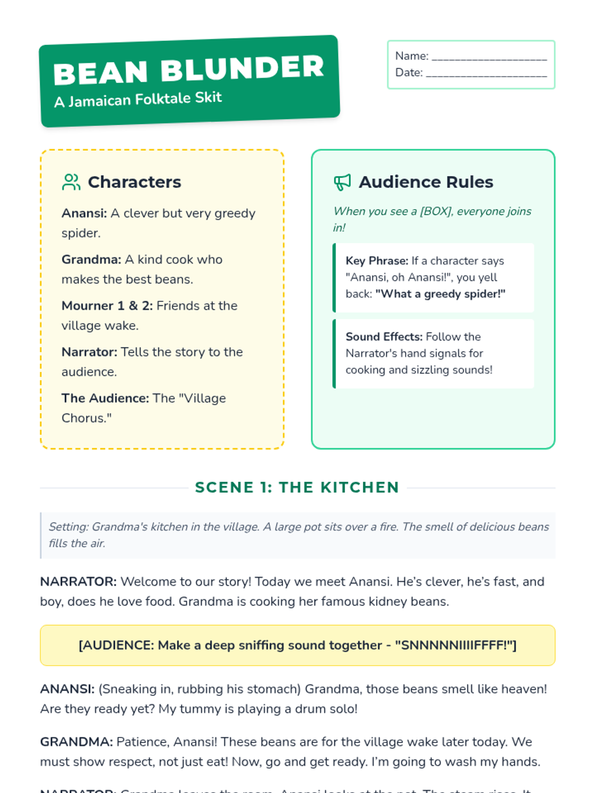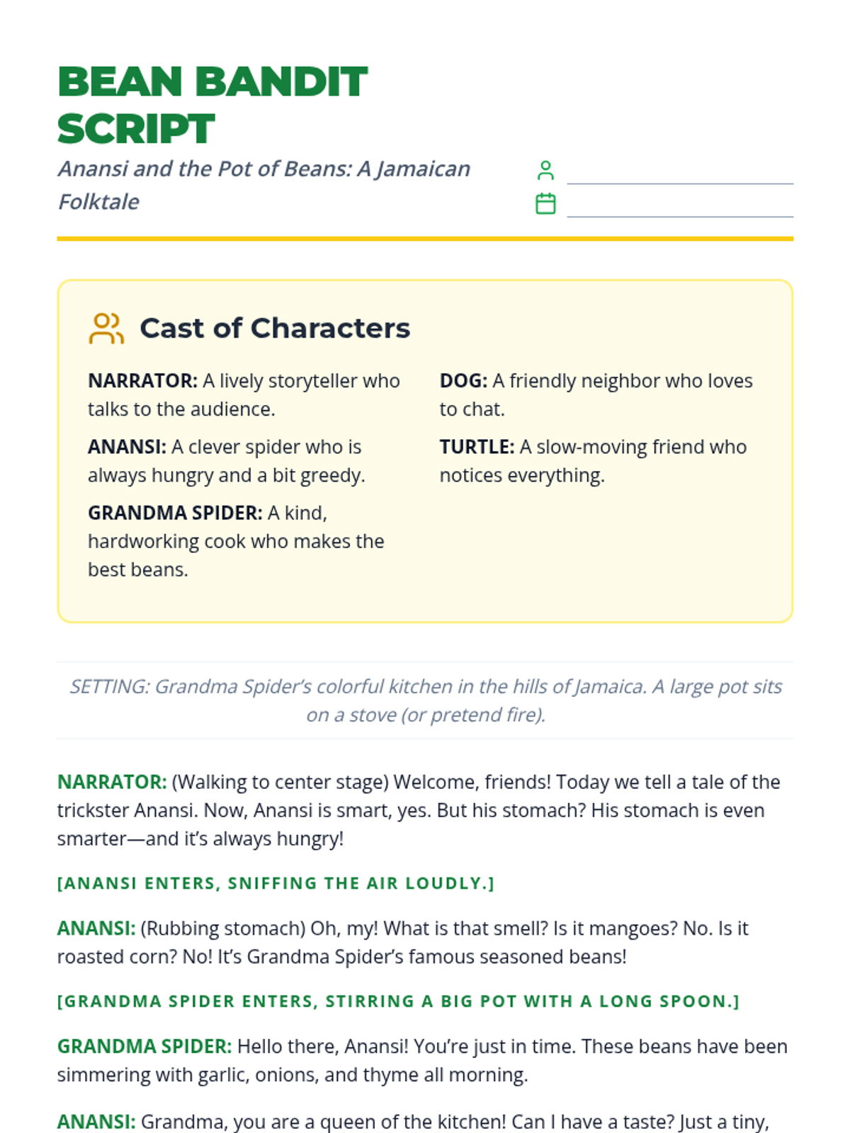 A 3-page script for a 4th-grade performance of 'Anansi and the Pot of Beans,' featuring bold character roles, clear audience participation cues, and a vibrant Caribbean-inspired design.