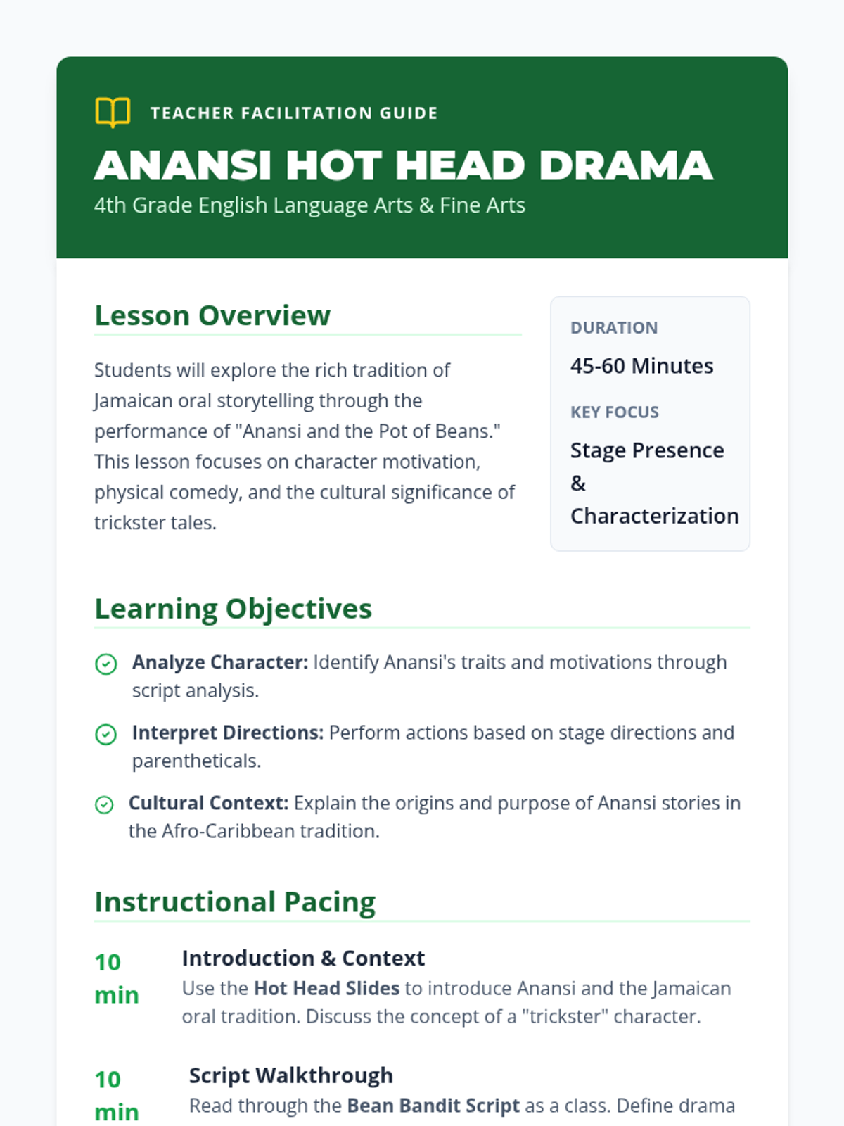 A comprehensive teacher guide for the Anansi drama lesson, featuring pacing, objectives, discussion prompts, and differentiation strategies.
