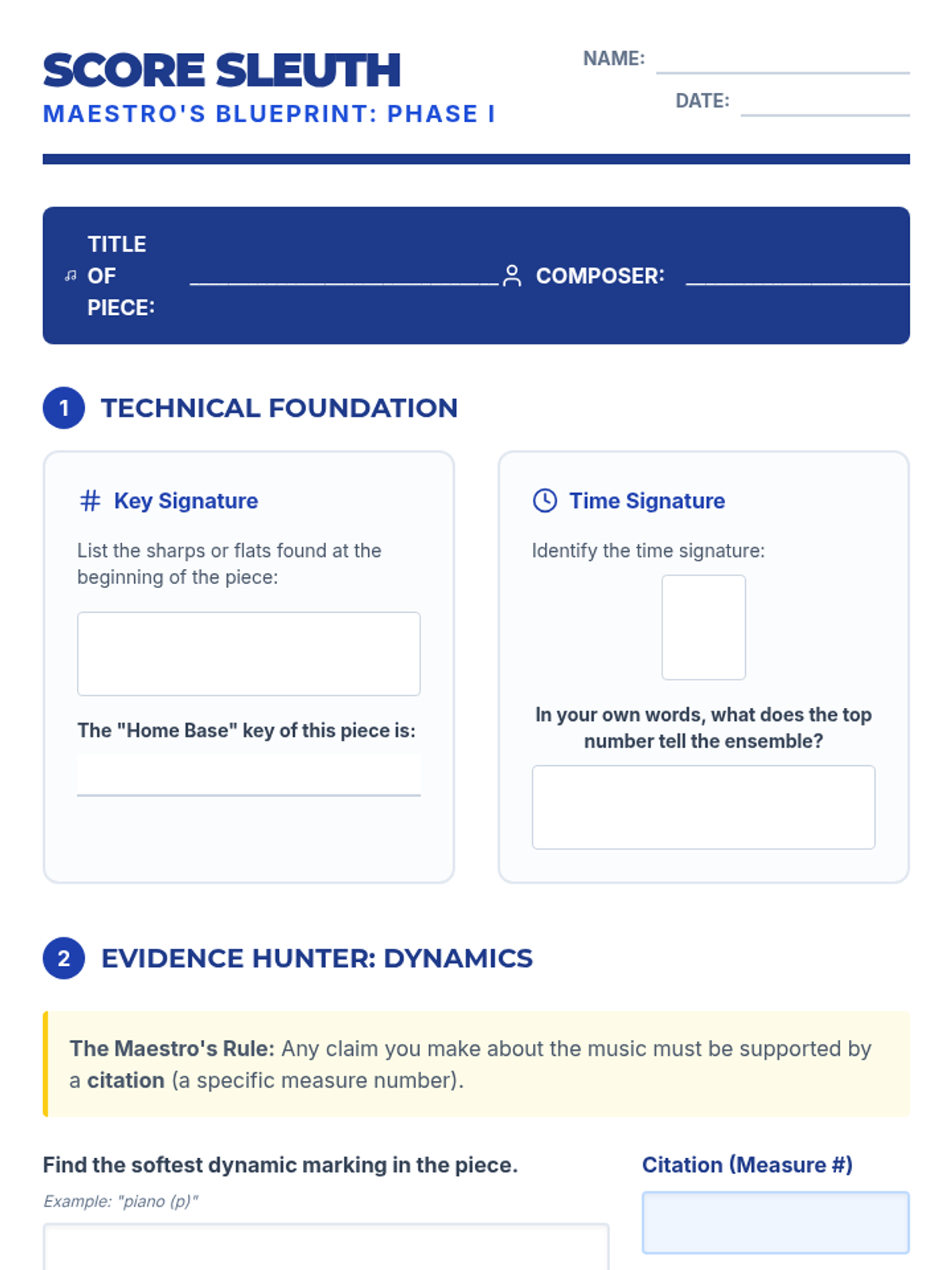A student worksheet designed to guide middle school music students through an evidence-based analysis of their ensemble scores, focusing on technical elements and dynamic citations.