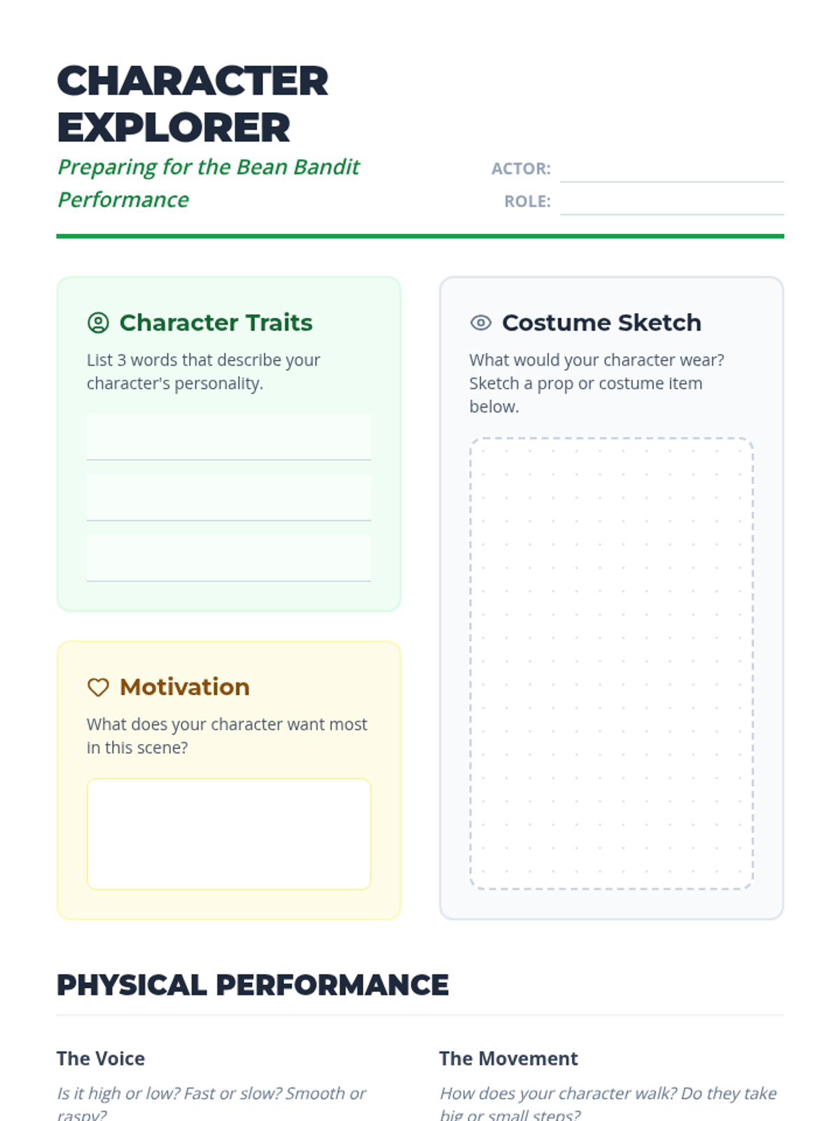 A character development worksheet for students to analyze their assigned roles, plan their voice and movement, and sketch costume ideas.