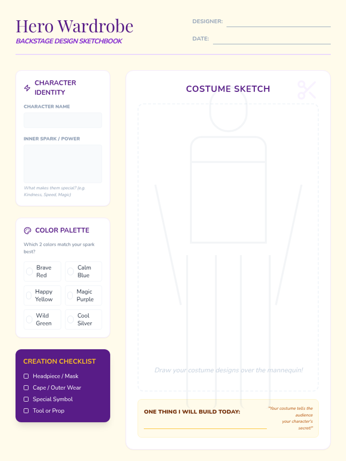 A creative design worksheet for students to conceptualize their character, choose a color palette, and sketch a costume design over a mannequin template.