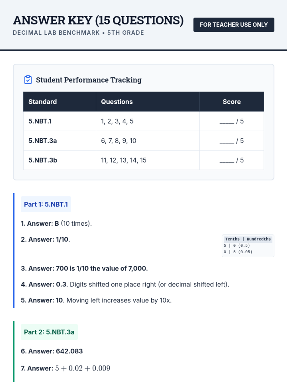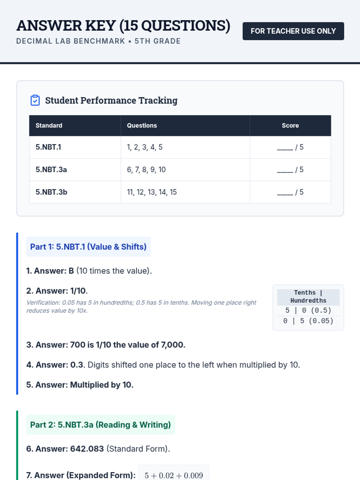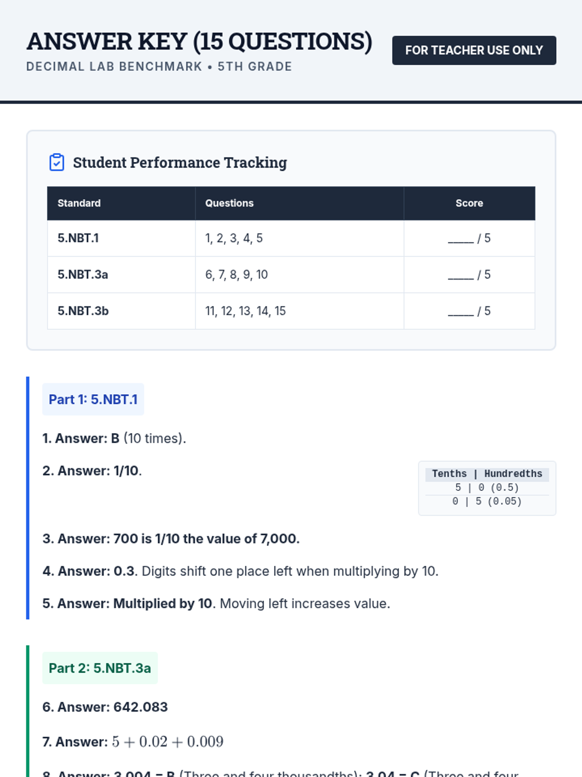 Comprehensive teacher answer key for the 15-question Decimal Lab Benchmark. Includes a student performance tracking table, detailed answers for all 5 questions per standard, and a quick diagnosis guide for intervention planning.