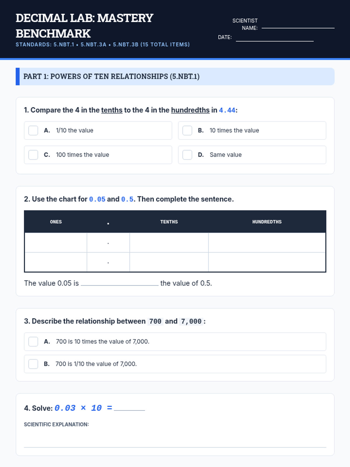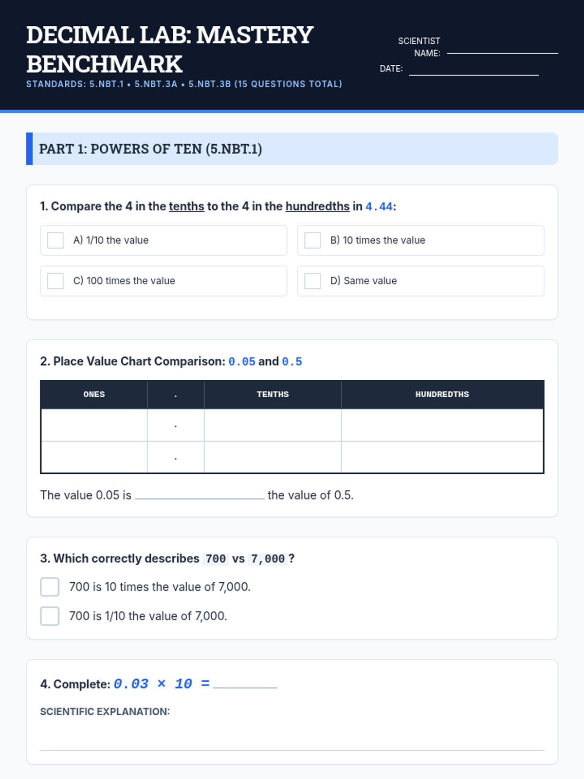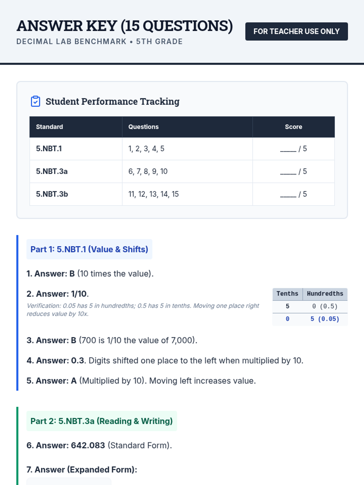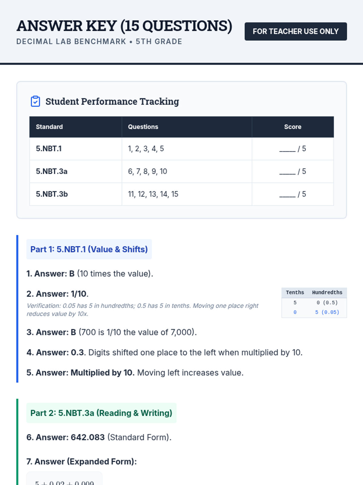 Comprehensive teacher answer key for the 15-question Decimal Lab Benchmark. Includes a student performance tracking table, detailed answers for all 5 questions per standard, and a quick diagnosis guide for intervention planning.