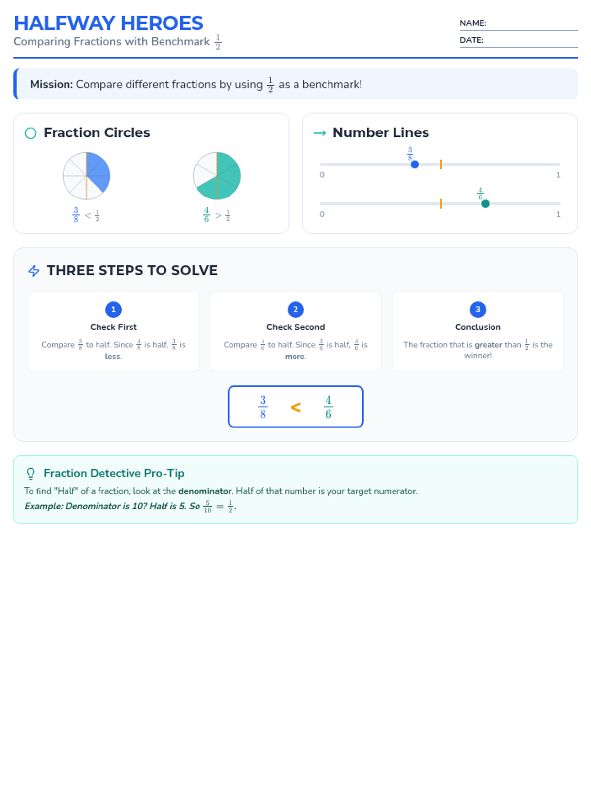 A vibrant one-page student reference sheet for comparing fractions with different numerators and denominators using 1/2 as a benchmark. Includes visual comparisons using fraction circles and number lines, alongside a step-by-step strategy for notebook reference. Revised to fit a single page and include more detailed visual cues.