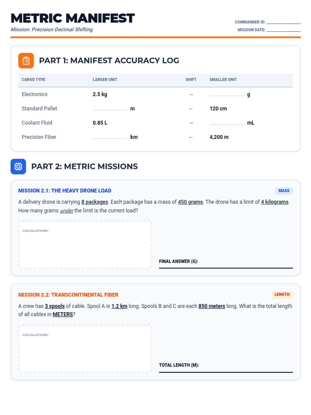 A two-page student worksheet focused on multi-step metric conversions (mass, capacity, length). Includes a manifest log for precision practice and four complex real-world logistics problems.