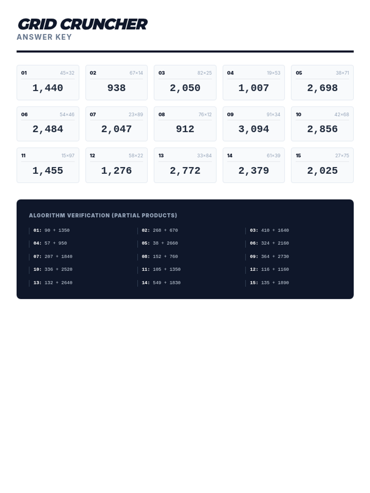 The answer key for the Grid Cruncher worksheet, featuring high-contrast results and detailed partial product checkpoints for student verification.