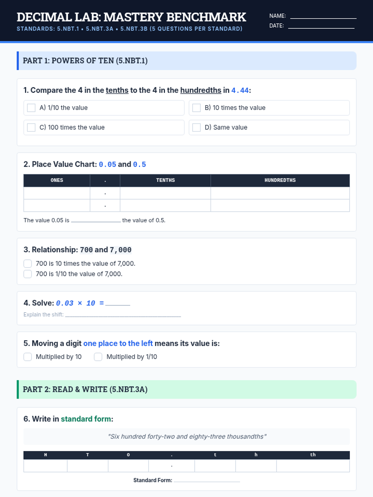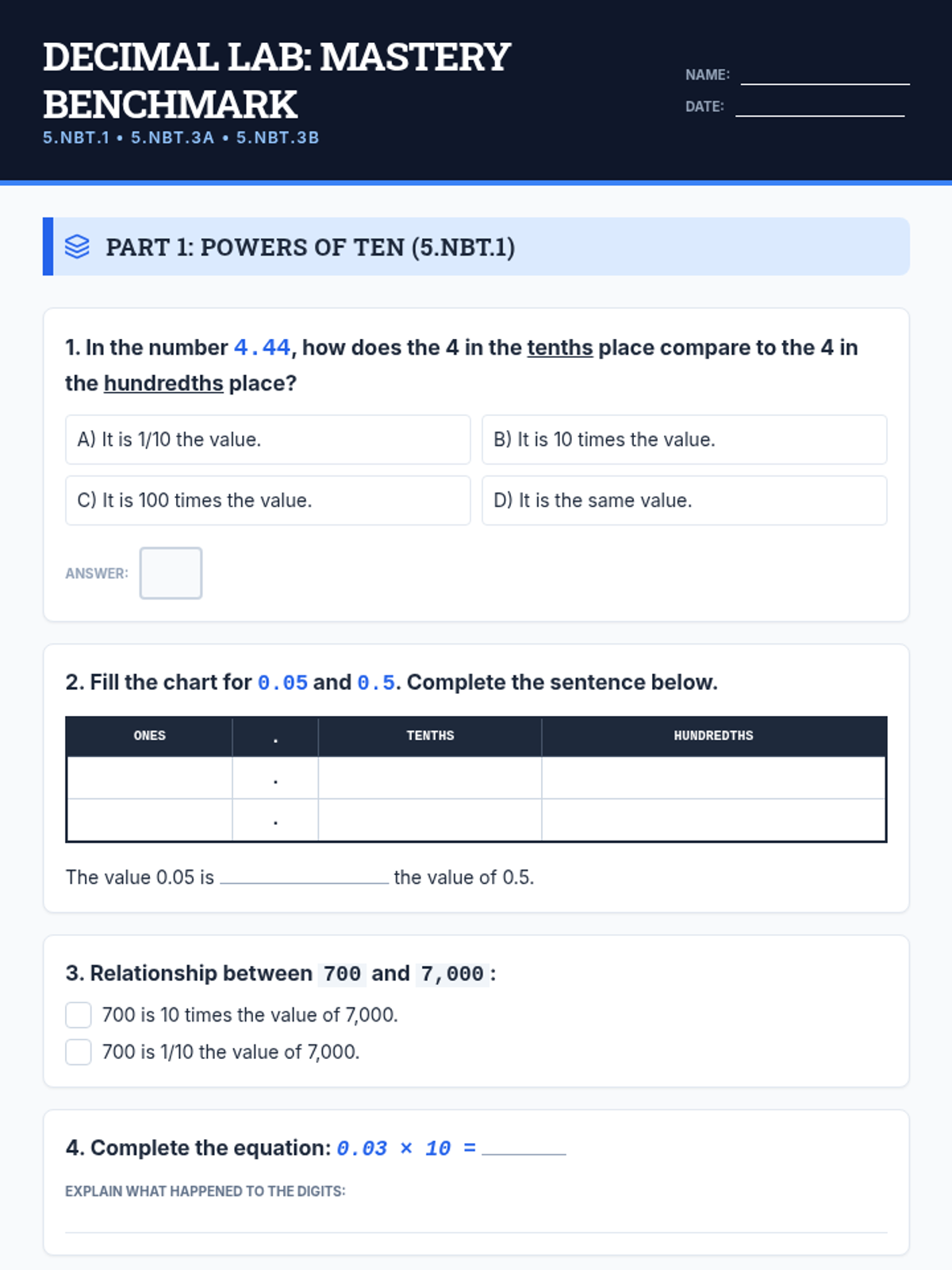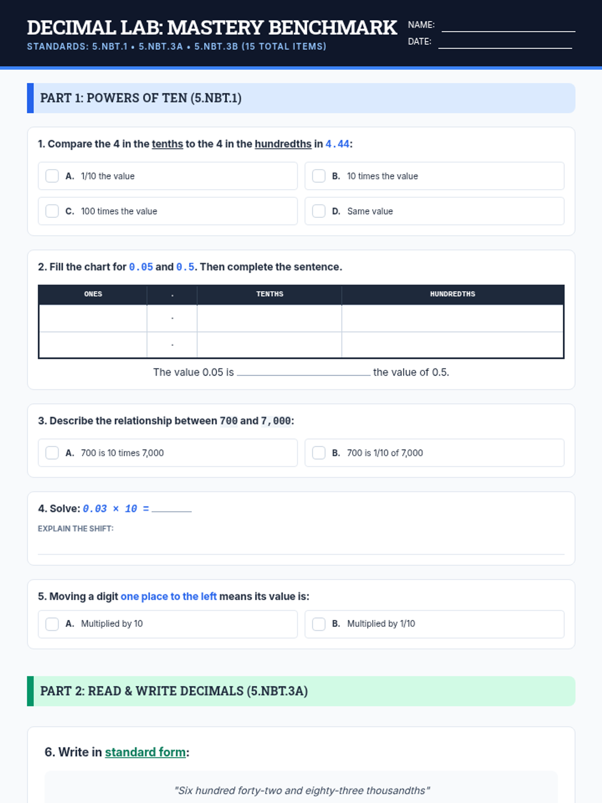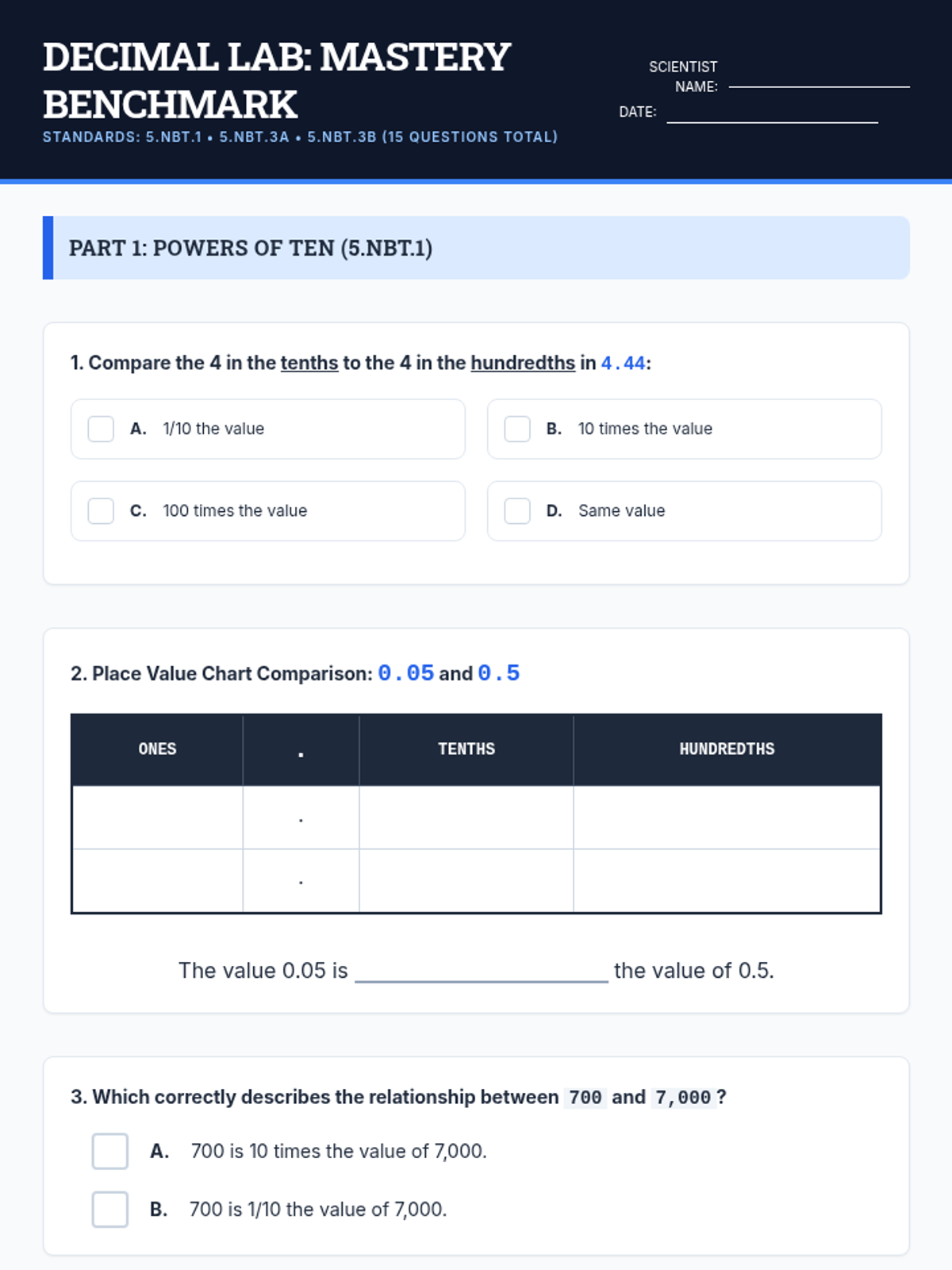 An expanded 5th-grade math benchmark assessment featuring 5 questions per standard (5.NBT.1, 5.NBT.3a, 5.NBT.3b). This version includes renumbered questions, additional place value checks, and comprehensive comparison tasks to identify student struggle points. Layout is optimized for 3 full pages with large student work areas. Finalized polish on spacing and alignment. Added ruled lines for handwriting legibility.