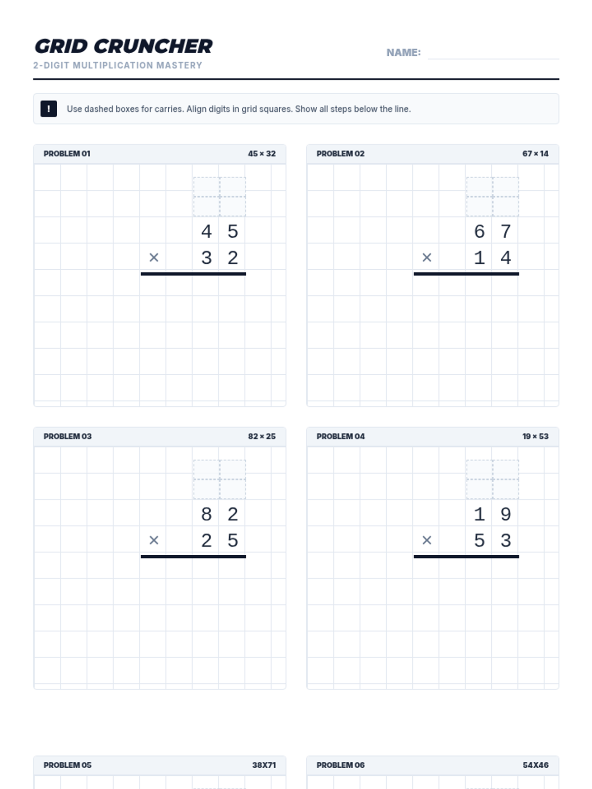 A 2-digit by 2-digit multiplication worksheet with 15 problems, featuring a high-contrast square grid layout to assist students with column alignment. Each problem includes dedicated regrouping boxes to manage carries.