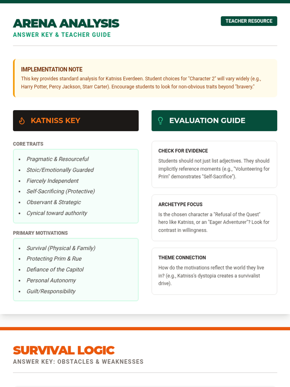 A teacher answer key and grading guide for the Arena Analysis Worksheet, providing detailed examples for Katniss Everdeen's character profile.