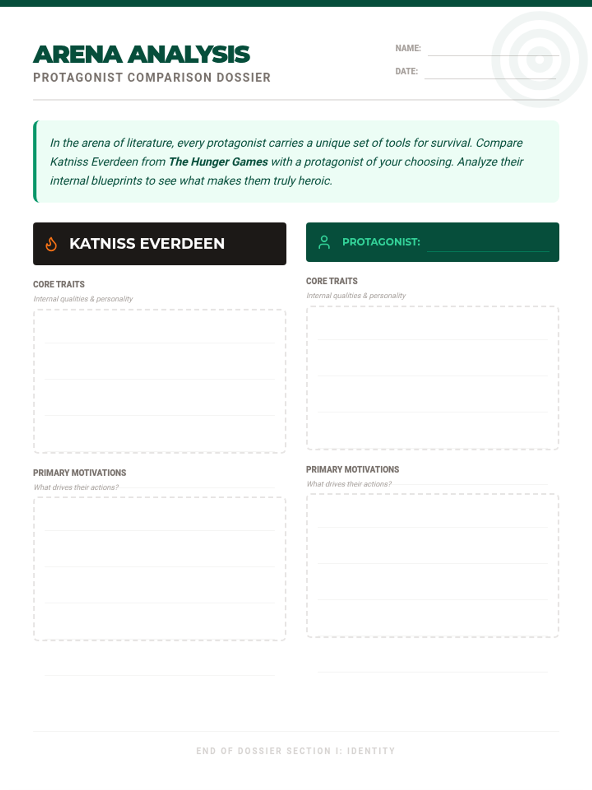 A two-sided character analysis worksheet for ELA students to compare Katniss Everdeen with another protagonist, focusing on traits, motivations, and obstacles.