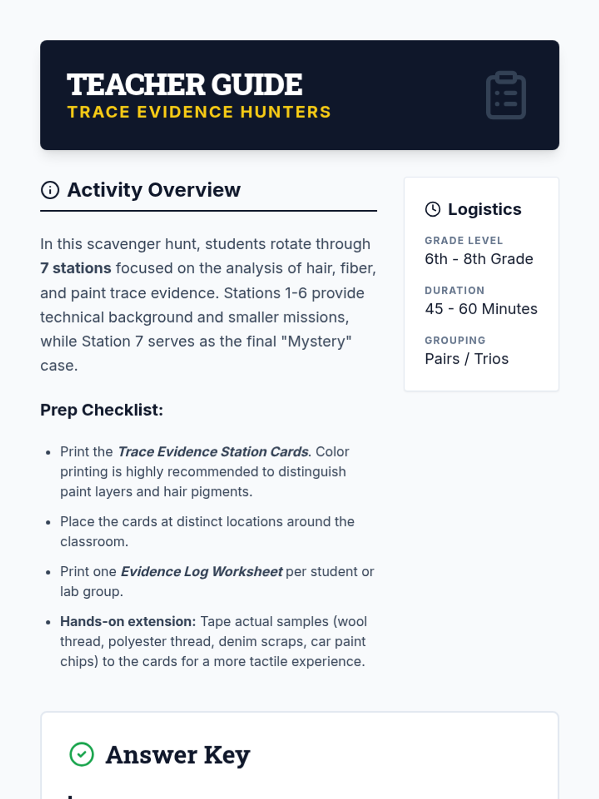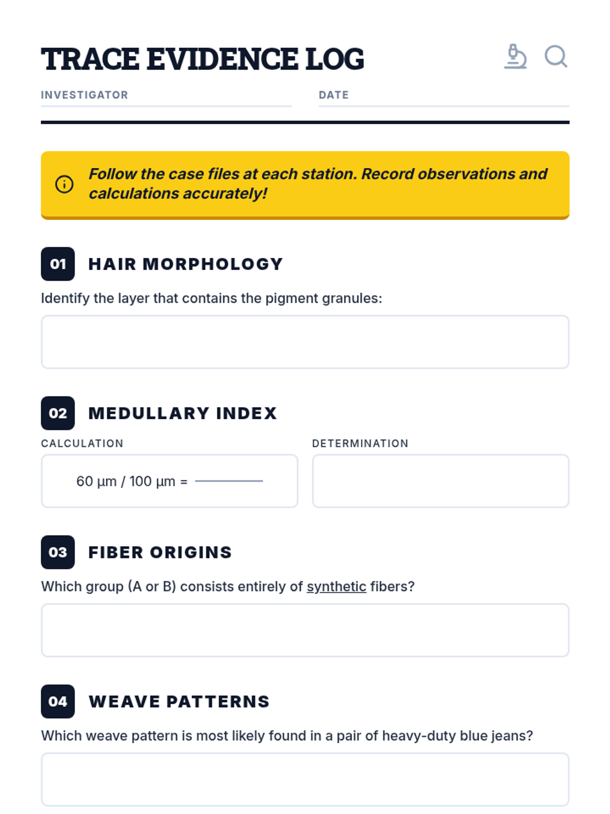 A student-facing detective log sheet for recording observations during the trace evidence scavenger hunt, with simplified language and large boxes for younger kids.
