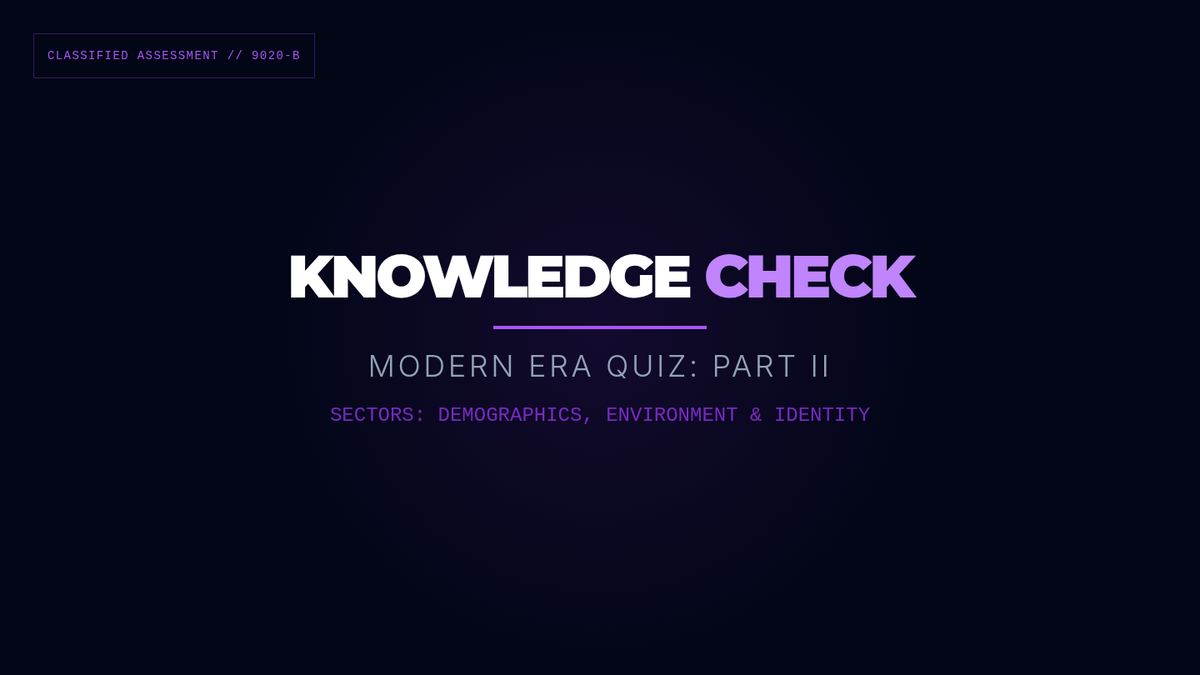 A 12-slide review deck featuring the stimulus-based questions from Modern Era Quiz Part 2. High-contrast dossier theme with large readable text and data visuals (tables/lists). Includes a summary answer key slide.