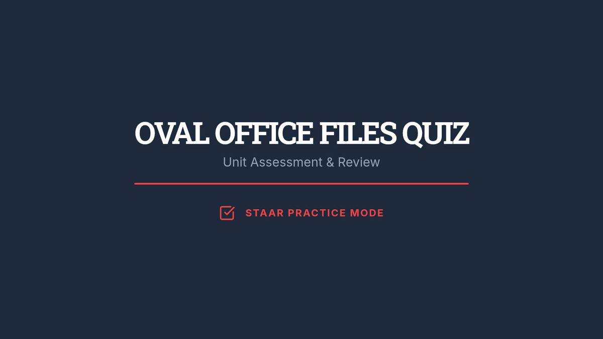 A 10-question multiple-choice assessment for the Oval Office Files lesson, modeled after 11th-grade US History STAAR questions with visual stimuli (graphs, diagrams, and quotes) and a short-answer critical thinking prompt.