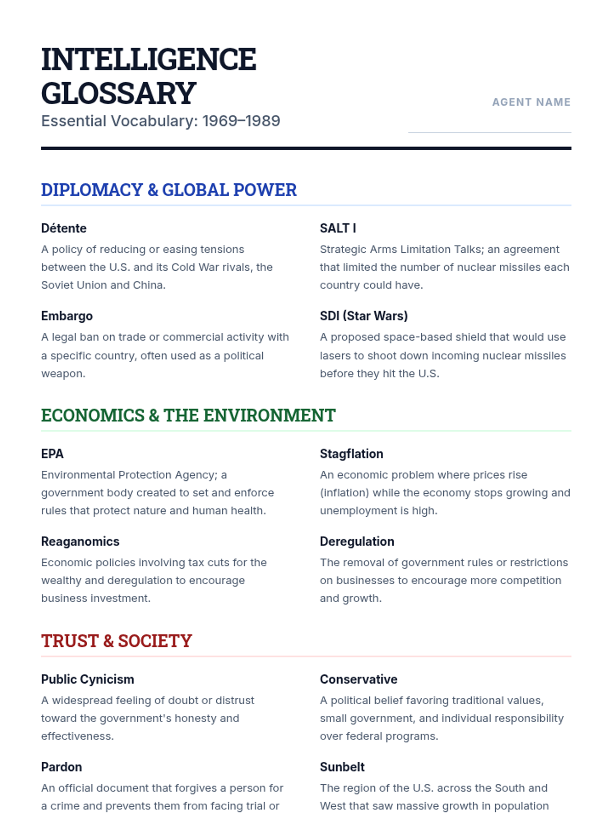 A comprehensive vocabulary reference sheet featuring 12 key terms from the 1970s and 1980s, categorized by theme with definitions optimized for a 9th-grade reading level.