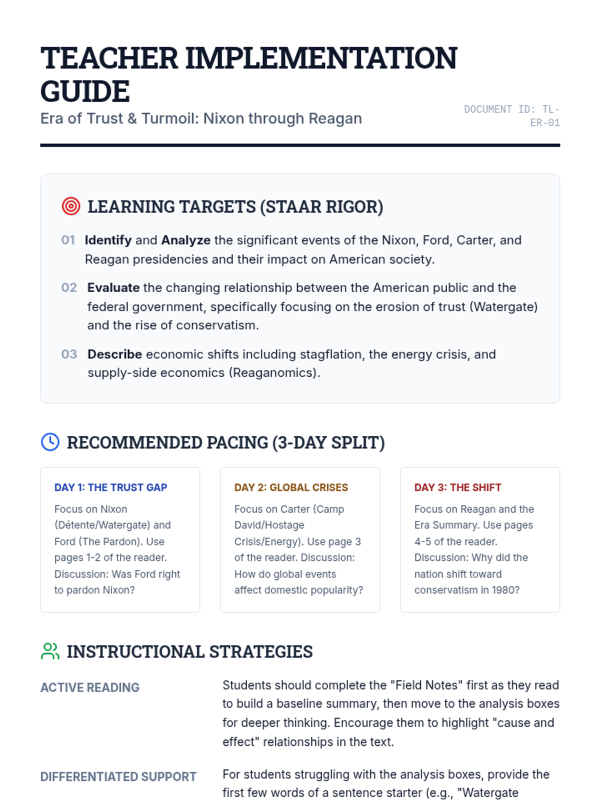 A comprehensive teacher implementation guide featuring learning targets, a 3-day pacing guide, instructional strategies for 9th/11th grade rigor balance, and annotated discussion points for the Oval Office reader and briefing notes.