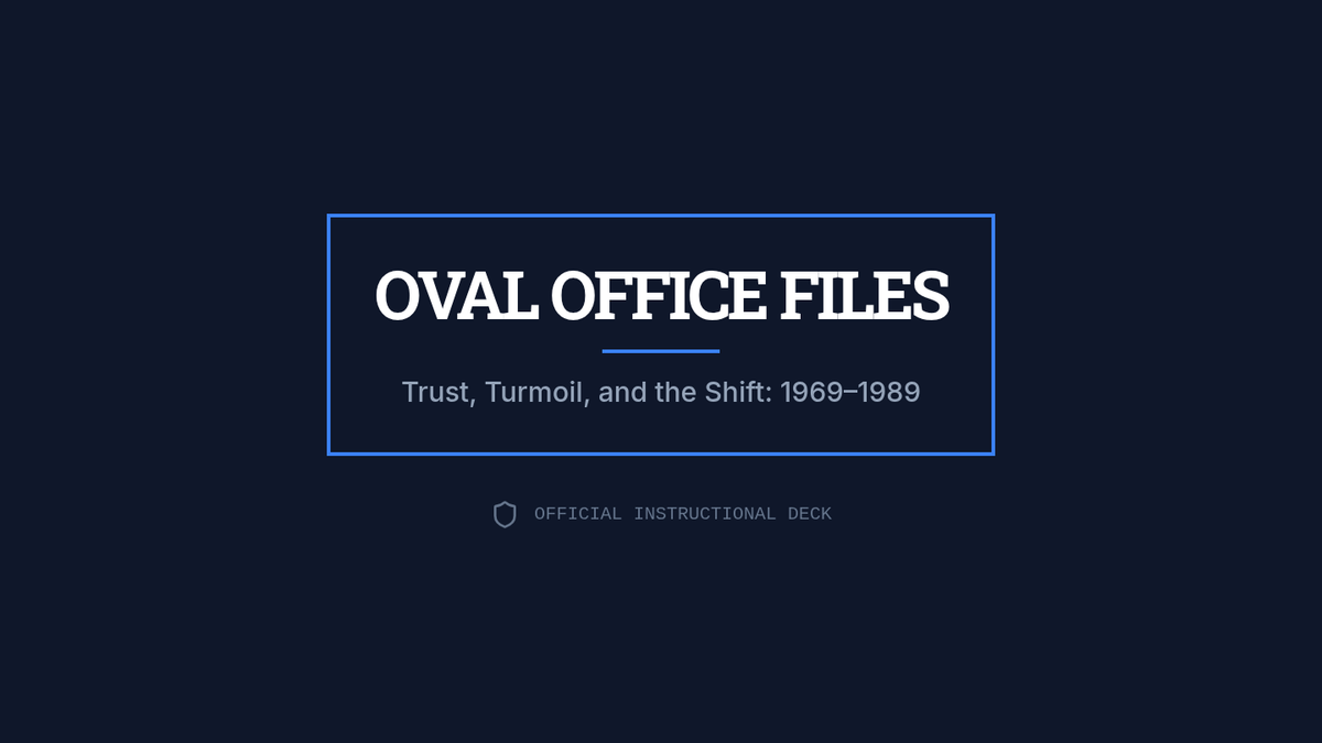 An instructional slide deck that guides students through the presidencies of Nixon, Ford, Carter, and Reagan, focusing on shifts in public trust, economic policy, and the end of the Cold War.