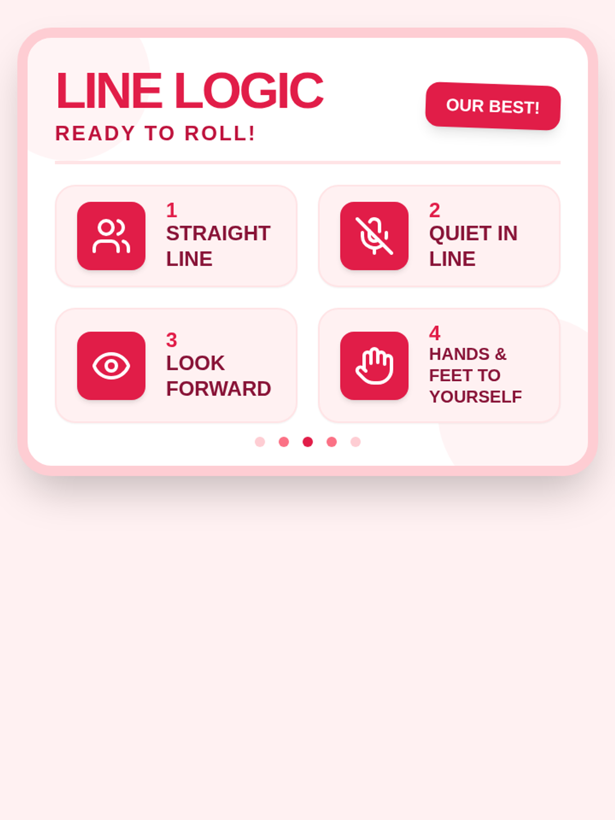 A vibrant, pink-themed anchor chart for elementary students demonstrating the 4 key rules for walking in a line: staying straight, being quiet, looking forward, and keeping hands/feet to oneself. Designed with a landscape orientation and high-impact visuals.