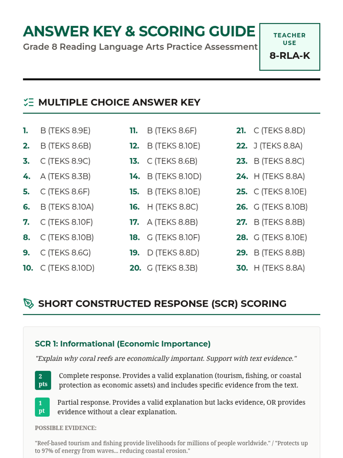 A comprehensive answer key and scoring guide for the 8th-grade STAAR Practice Reading Assessment, featuring TEKS-aligned answers and scoring rubrics.
