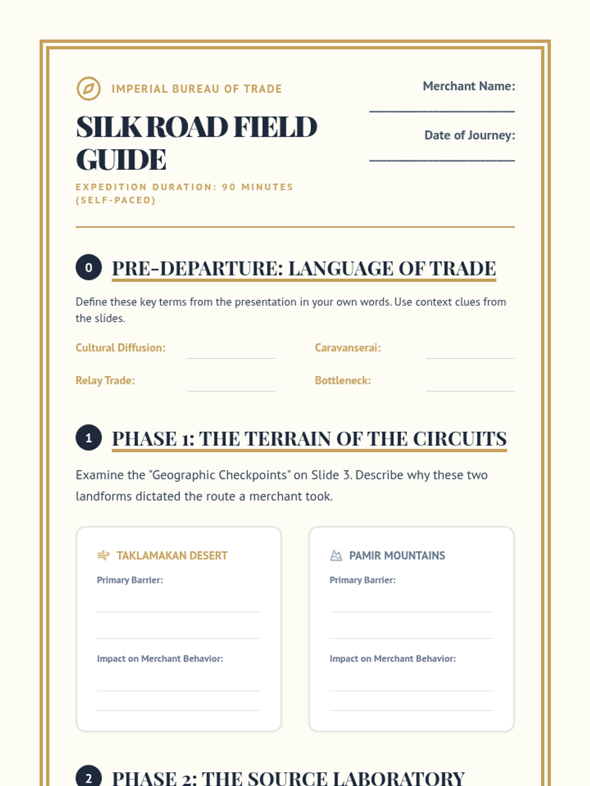 An expanded student field guide for a 90-minute Silk Road lesson, including topography analysis, primary source comparison, and a study of the Bubonic Plague.