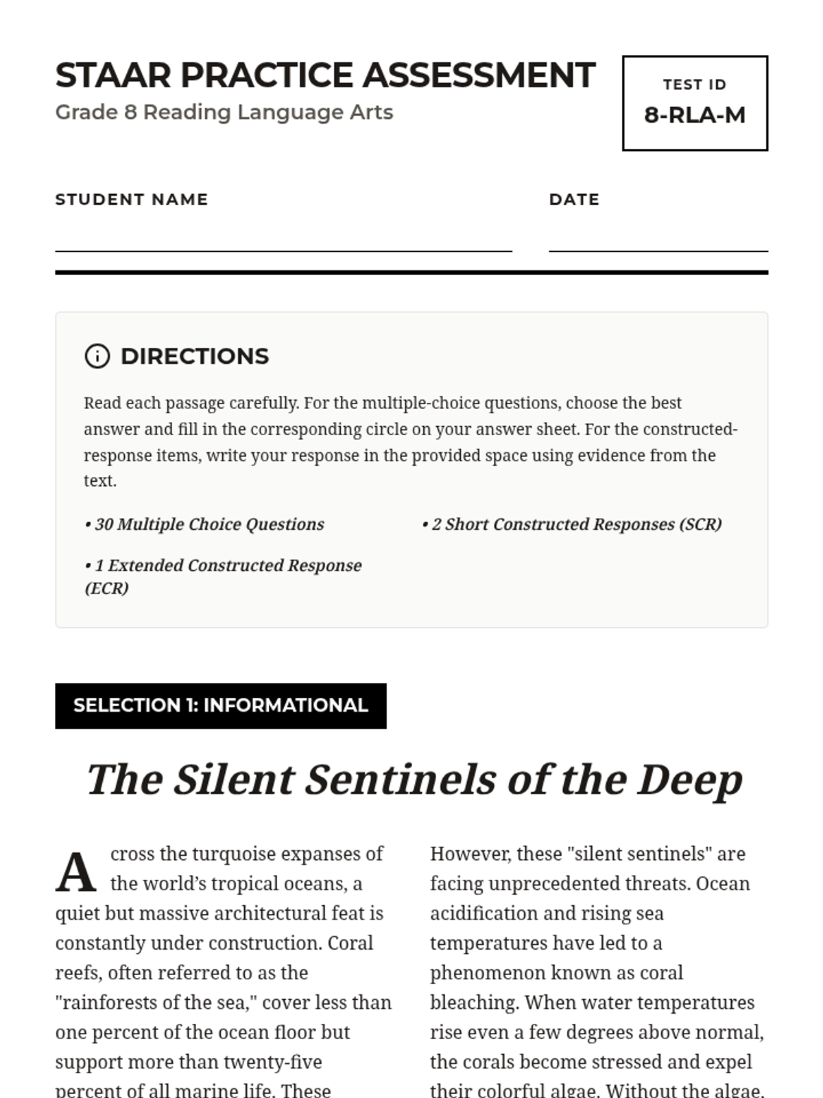 A full-length 8th-grade STAAR reading practice assessment featuring informational and fiction passages with 30 multiple-choice questions, two SCRs, and one ECR.