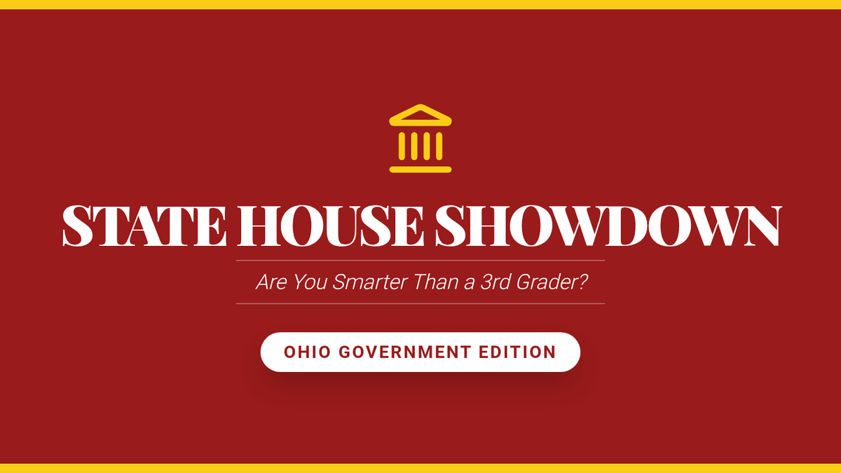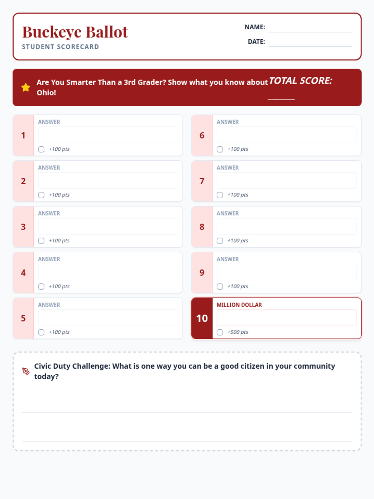 An interactive slide deck for the 'State House Showdown' game. Redesigned for better layout containment, consistent scoring (1400 total), and improved visual illustrations for RI.3.7. Now includes all 10 questions for full standard alignment.