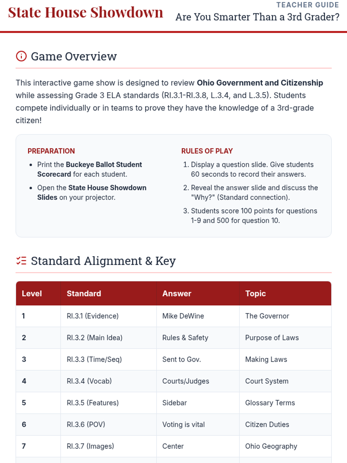 A comprehensive guide for teachers to facilitate the 'State House Showdown' game, including standard alignments (RI.3.1-RI.3.8, L.3.4, L.3.5), an answer key, and instructional tips. Updated to ensure table formatting remains on a single page.