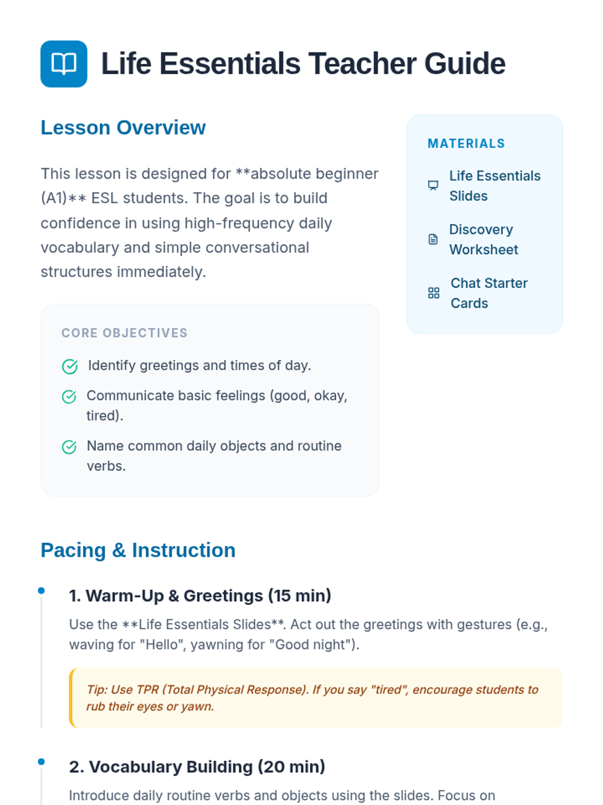 A comprehensive teacher guide for facilitating the Life Essentials lesson, including pacing, pronunciation tips, differentiation strategies, and extension activities.