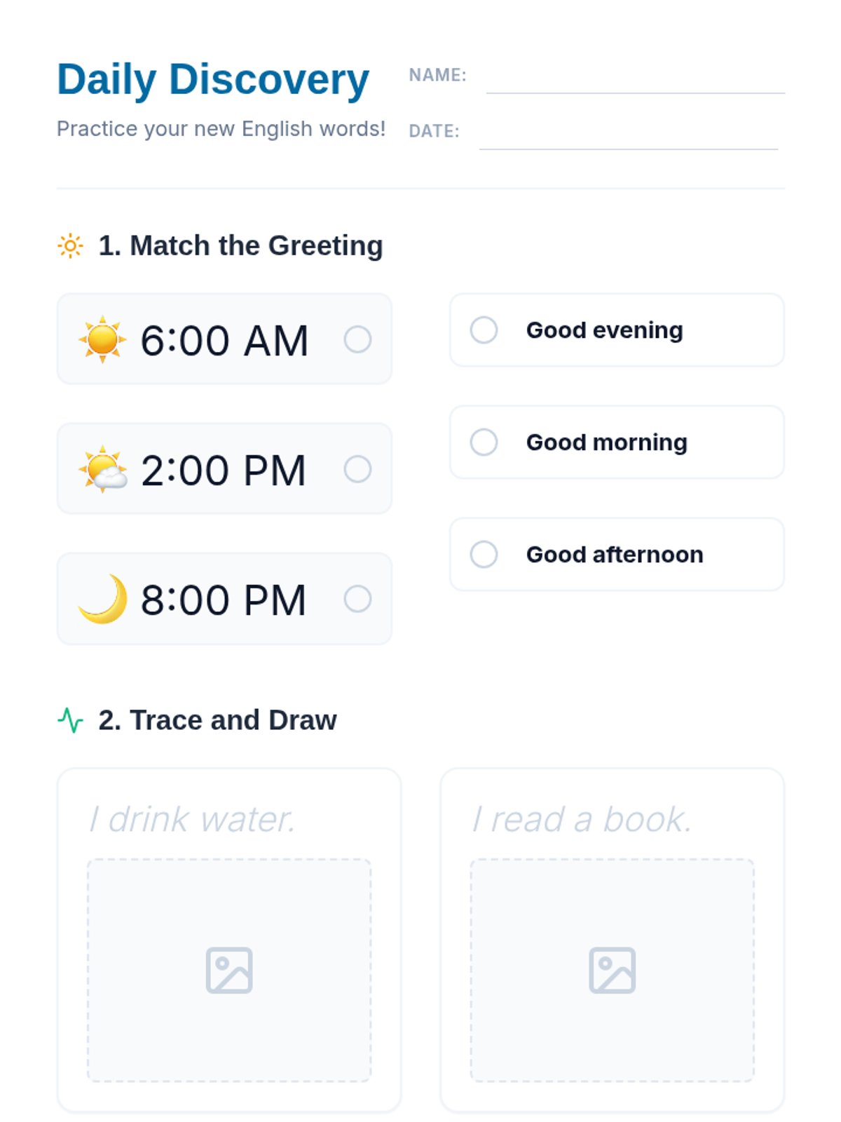 A 2-page student worksheet for absolute beginners covering greetings, daily routine verbs (trace & draw), object identification, and a simple written dialogue practice.