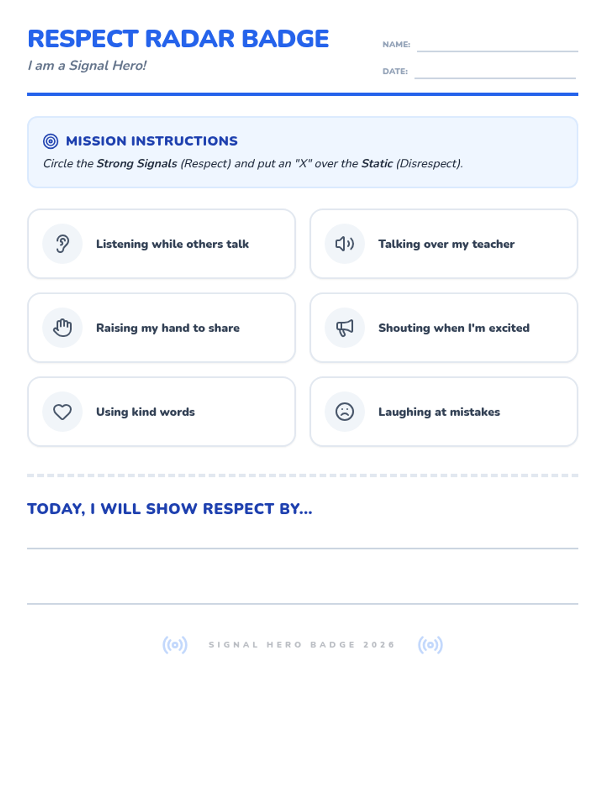 An interactive student worksheet for a respect lesson, featuring a "Signal Sort" activity and a reflection prompt for practicing respectful behaviors.