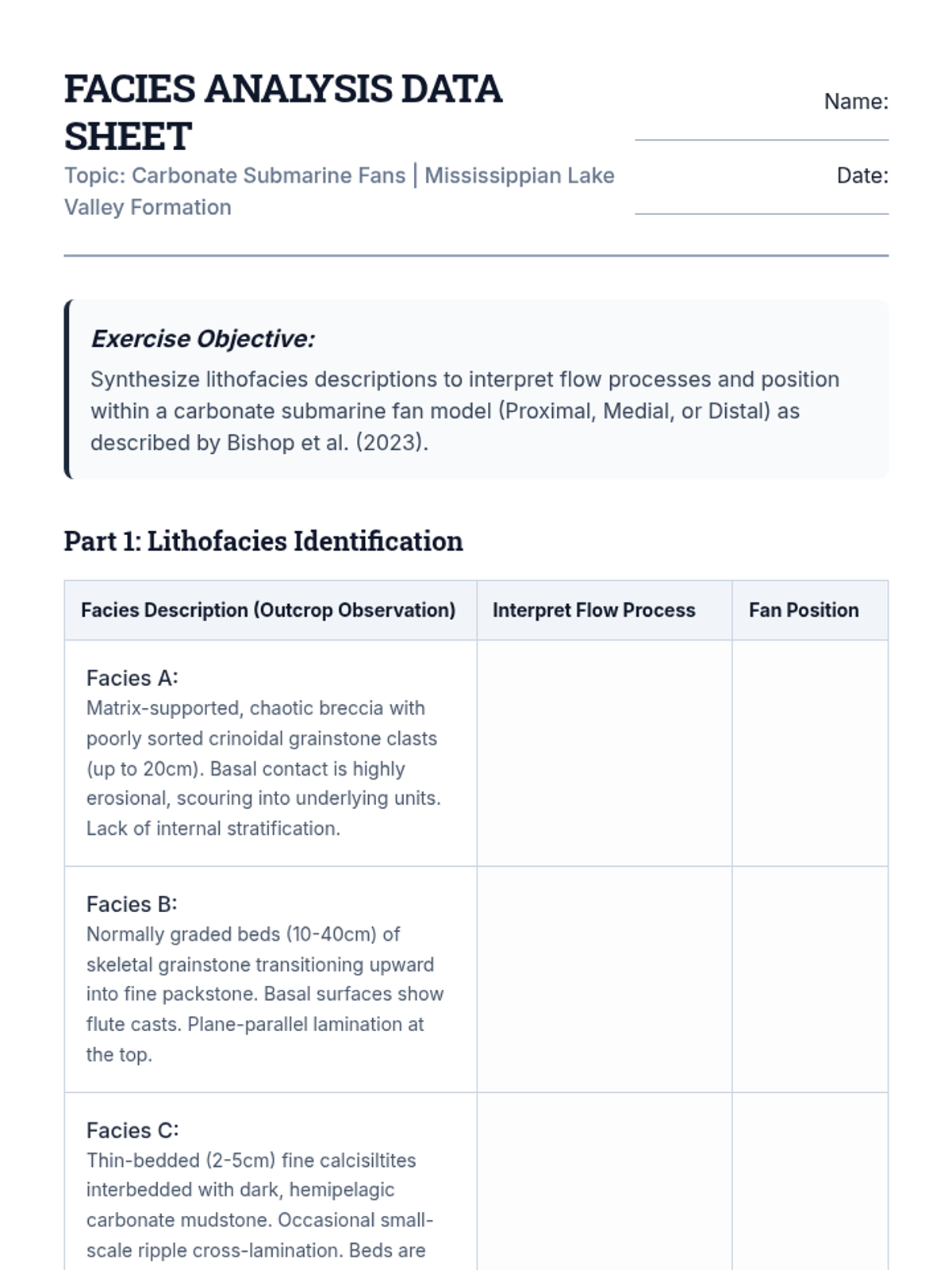 An in-class activity worksheet for graduate students to analyze lithofacies descriptions and interpret depositional architecture within a carbonate fan system.