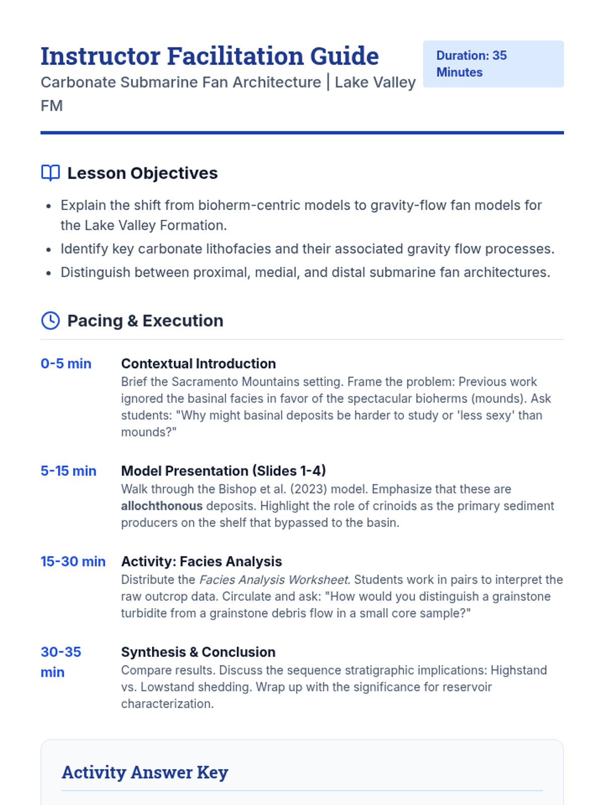 An instructor facilitation guide for the Carbonate Fan Architecture lesson, including pacing, discussion prompts, and an answer key for the student activity.
