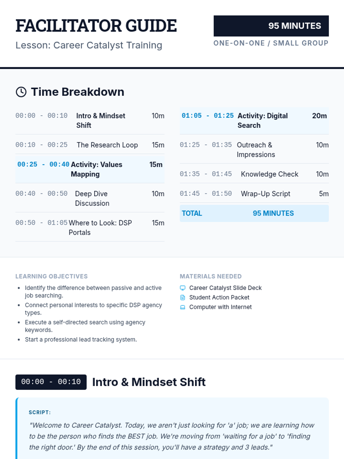A comprehensive 95-minute facilitator guide featuring precise timing, instructional scripts, and troubleshooting tips. It breaks the lesson into manageable sections with specific 'Say This' prompts and discussion boosters.