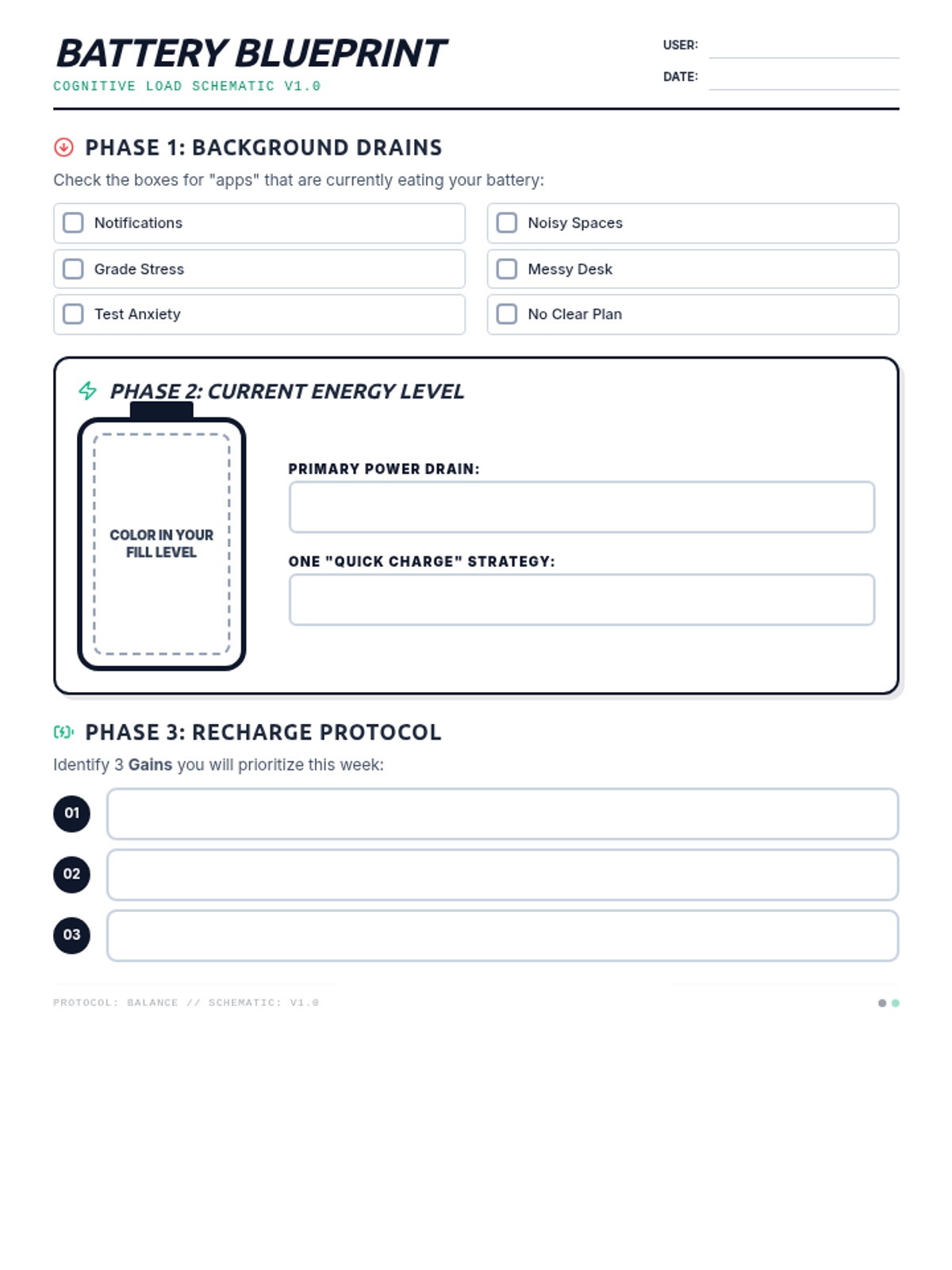 A worksheet for students to map their energy drains and plan their 'recharge protocol' using a battery schematic theme. Revised for better legibility and single-page layout.