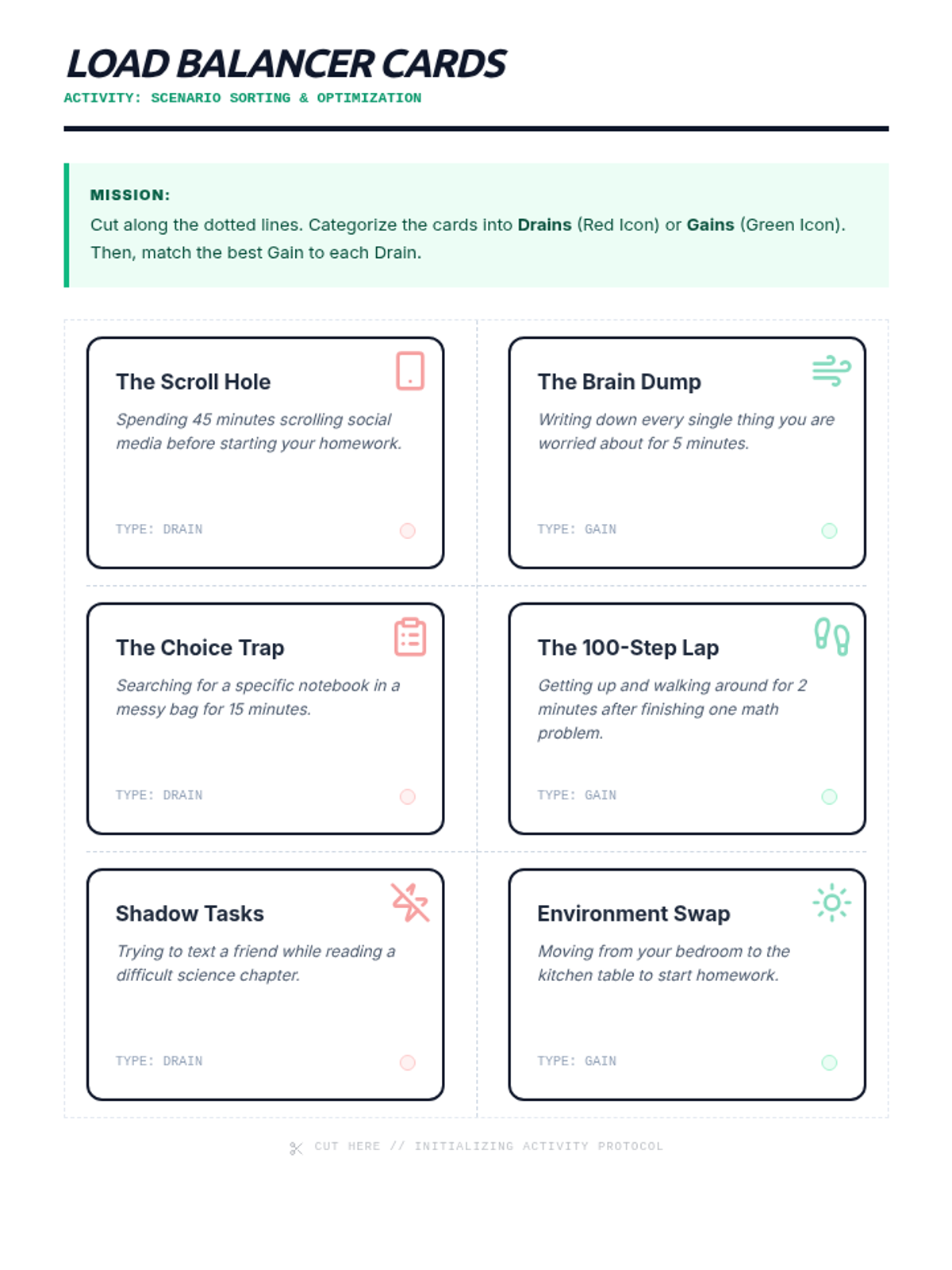 A set of scenario cards for a sorting activity. Revised to fit on one page with clear cutting guides and optimized spacing.
